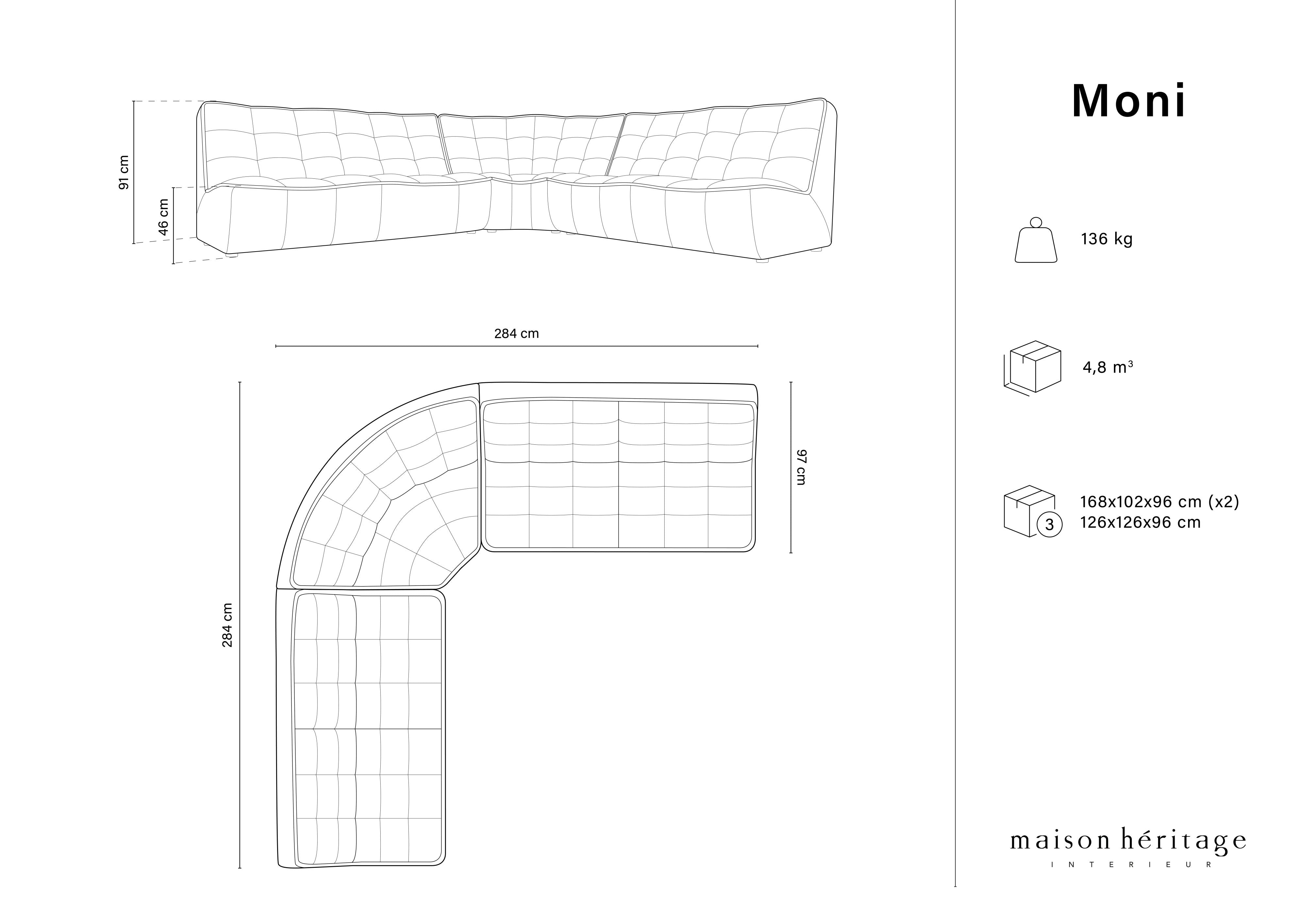 Upholstery made of structural fabric, whose finely woven structure resembles velvet with a heterogeneous surface, is pleasant to the touch and extremely durable. Ergonomic shapes ensure free support. The Moni collection includes several combinations of sofas and corners, as well as elements such as chaise and poufs.