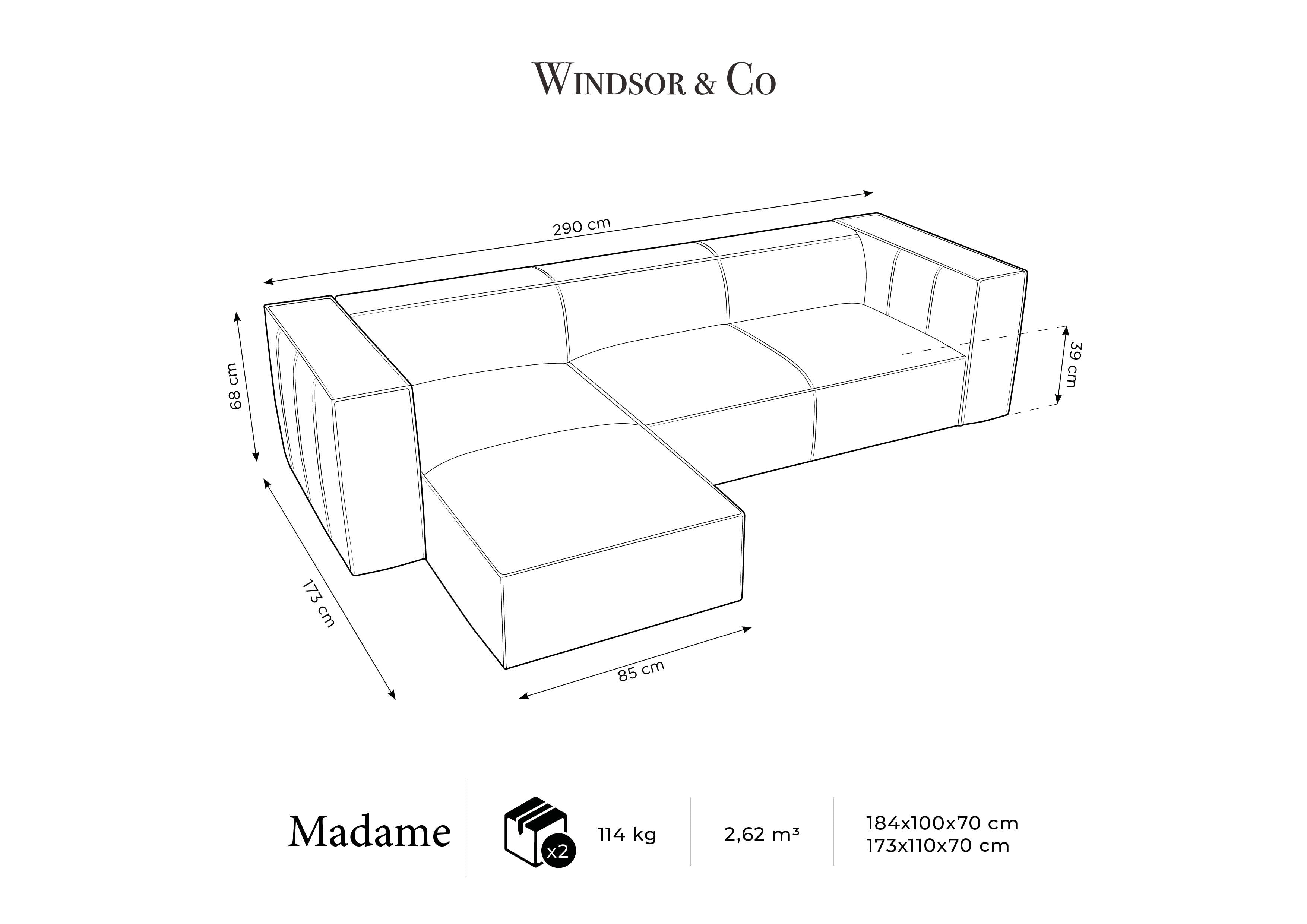 A corner for four people Madame with a distinct character and an elegant finish is a great choice for a modern living room. The deep seat is both perfect for social gatherings and until a moments of relaxation after a hard day. It allows you to conveniently rest in free positions. With a low -set figure, wide armrests and backs, it creates a cozy block.