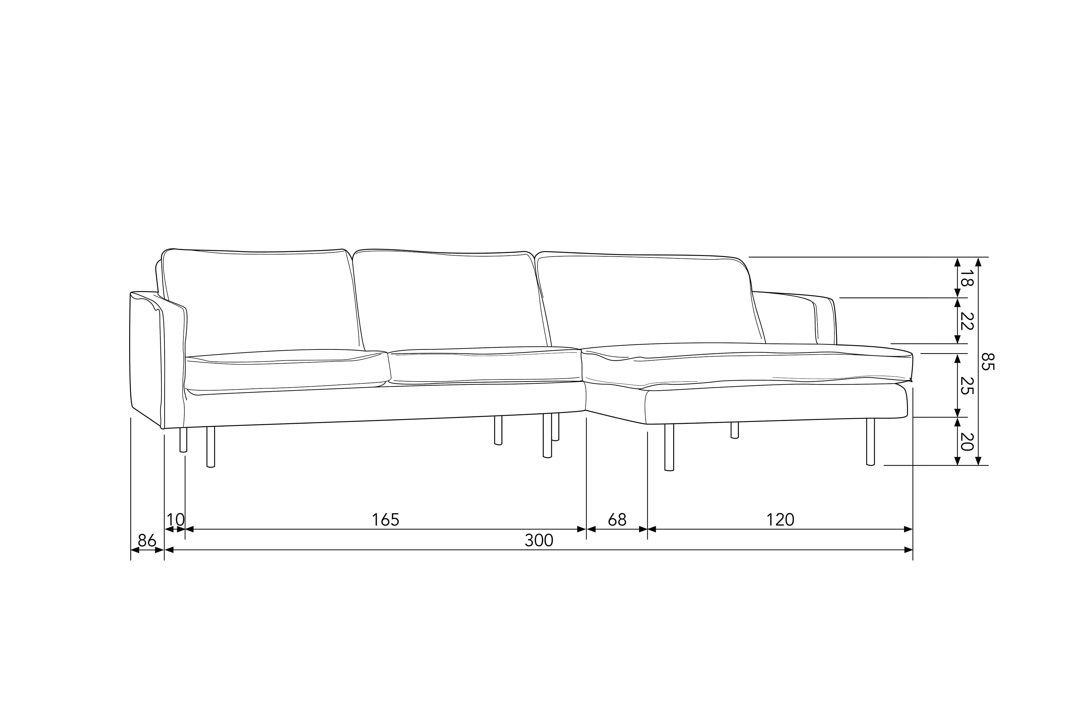Right -hand corner Rodeo is an elegant and functional piece of furniture that provides a lot of space to sit. The slender frame and loose pillows give it a designer look, and velvety material and black metal legs give it a unique character.