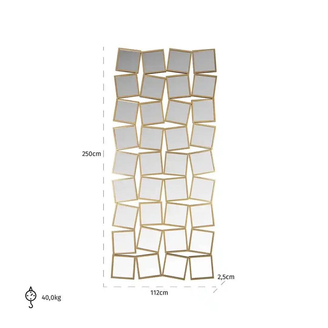 Eye-catching decorative mirror Badia in a golden frame with a geometric pattern is a modern element that draws attention and highlights the character of the interior. Composed of multiple mirrored modules, the structure creates an original, three-dimensional composition that beautifully reflects light and adds depth to the space. It is perfect for a large living room, hallway, or commercial space as a unique wall decoration.