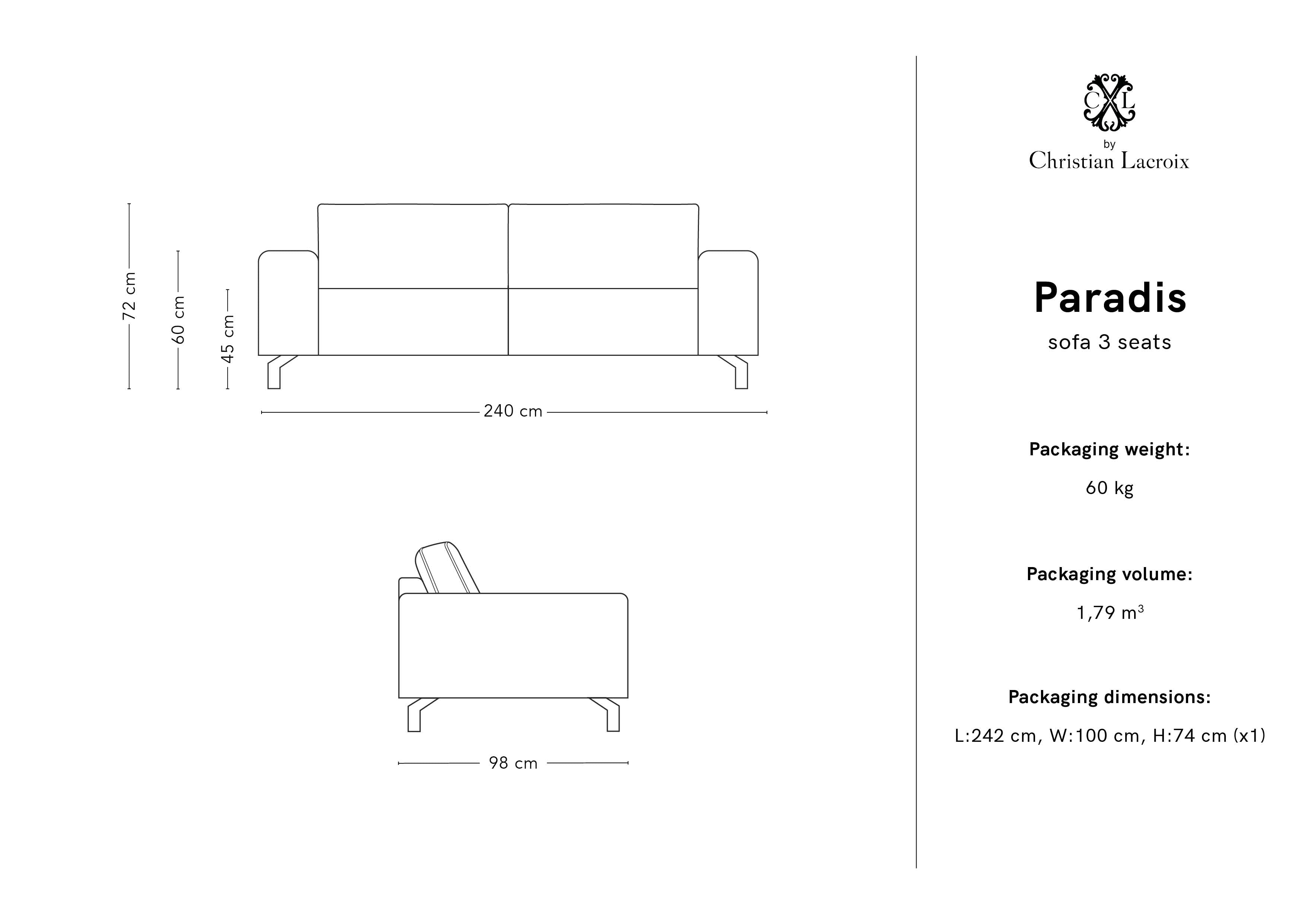 Velvet sofa for three people Tendance, signed by French fashion house Christian Lacroix, This is a beautiful combination of timeless elegance with modern design. The geometric and subtle shapes of this sofa will bring a bit of coziness to your interior. Its cubic design gives the whole a unique character.