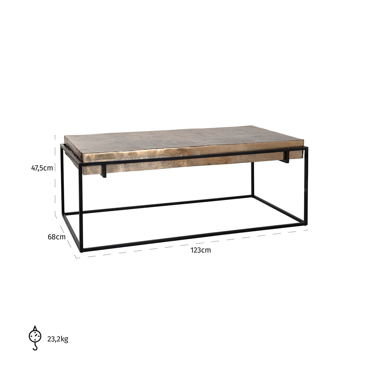 Calloway it unique coffee table, which is distinguished by both solidity and elegant appearance. It is made of a unique aluminum top in a beautiful shade of champagne gold, which gives it a luxurious glow and a unique look. This top harmoniously connects to the frame made of black metal, creating a contrasting and solid structure.