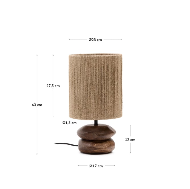 Tischlampe Kor ist ein einzigartiges Element, das rustikalen Charme und natürliche Akzente in den Innenraum einführt. Es besteht aus geschnitztem Akazienholz in einem dunklen Finish und beeindruckt mit einzigartigen Texturen und sorgfältigem Kunsthandwerk. Hand -begeistertes lahmes Lampenschirm verleiht ihm einen warmen, organischen Charakter, der perfekt zu natürlichen und gemütlichen Arrangements passt.