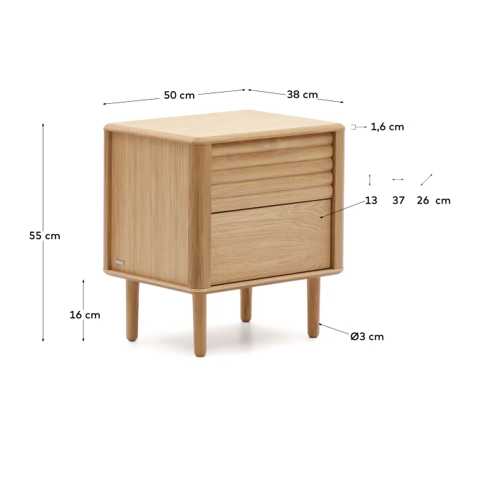 Schubladenmaterial: Eichenfurnier (Quercus alba), MDF (Faserboard mit mittlerer Dichte)