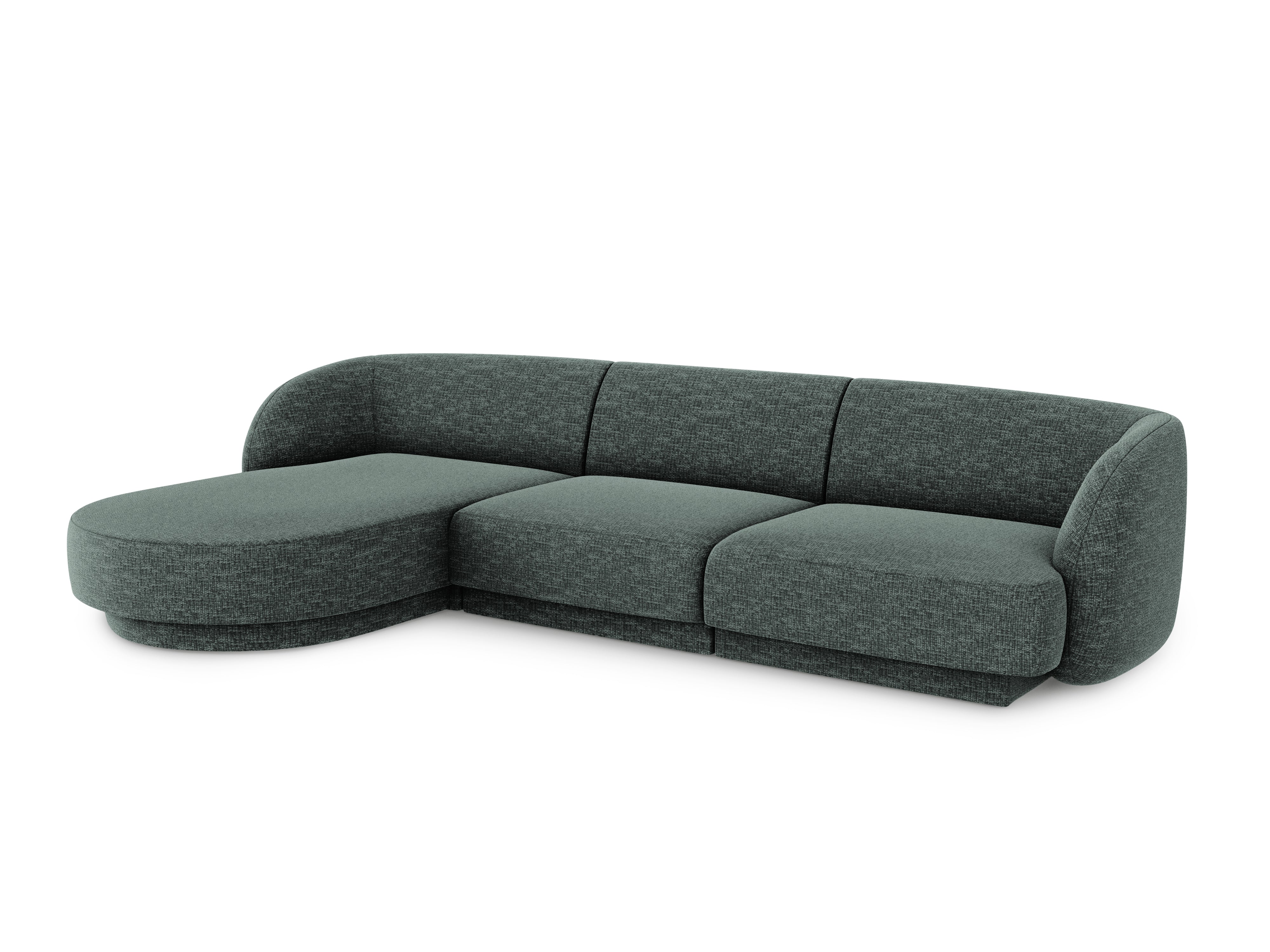 Ecksofa für vier Personen aus der Kollektion Miley bezaubert mit ihren abgerundeten Formen, die perfekt in die neuesten Einrichtungstrends passen. Neben der einzigartigen und minimalistischen Form zeichnen sie sich durch außergewöhnlichen Komfort aus. Die niedrige, umschlossene Rückenlehne geht nahtlos in die profilierten Armlehnen über und schafft ein stimmiges und natürliches Erscheinungsbild. Sie bieten auch die richtige Unterstützung in jeder Position, sowohl beim Sitzen als auch beim Liegen.