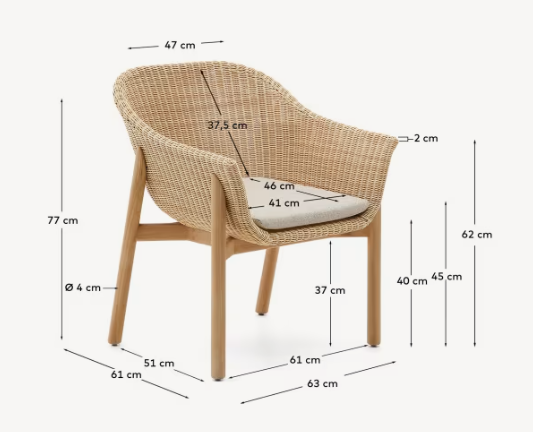 Materialien: 50% Tectona Grandis, 30% synthetischer Rattan, 15% Aluminium, 5% Stoff
