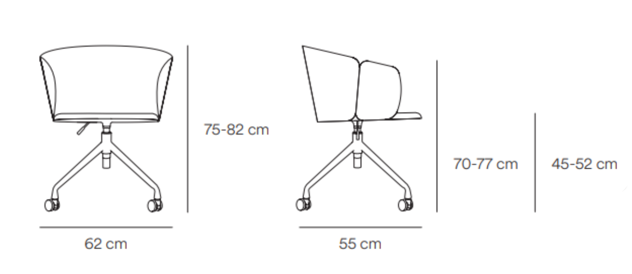 Stuhl mit Armlehnen Hinzufügen Es verfügt über eine Metalldrehbasis mit Rädern, die eine vollständige Bewegungsfreiheit gewährleisten. Dank dessen ist es eine ideale Wahl für verschiedene Räume wie Konferenzräume, Büros und öffentliche Räume. Sein universelles Design und die hohe Qualität der Verarbeitung lassen es perfekt in verschiedene Arten von Innenräumen integriert und sowohl Eleganz als auch Funktionalität verleihen.