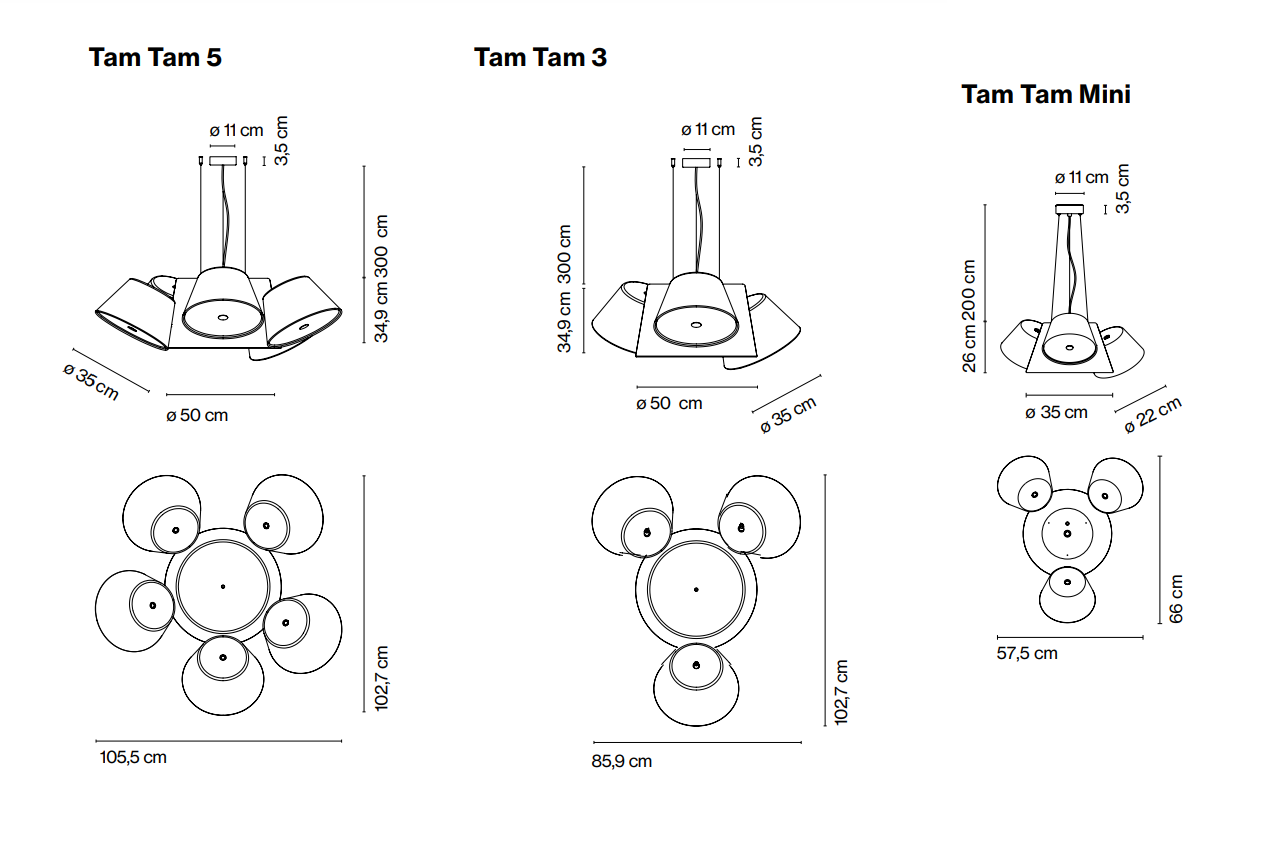 Pomysłowa i zabawna, Tam Tam jest dynamiczna w swojej konfiguracji i wyrazista w swoich kolorach. Obszerna kolekcja, która obejmuje lampy wiszące, ścienne i podłogowe, od samego początku wykorzystywała kolor do tworzenia objętości i akcentowania przestrzeni. Dekadę później kolekcja została zaktualizowana, aby zaoferować nowe możliwości. Błyszczące wykończenia stały się półmatowe i dodano nowe, delikatniejsze kolory, w tym niebiesko-szary i khaki dla lampy centralnej oraz srebrno-szary i oliwkowo-żółty dla lamp satelitarnych. Połączenie kolorów jest tym, co harmonizuje całość.
