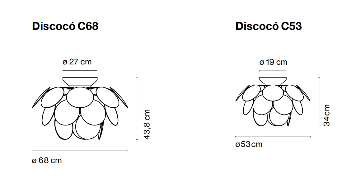 Zusätzliche Reflexionen spiegeln sich aus der Chrom -Hemisphäre wider, an die die Scheiben befestigt sind. Nach dem Ausschalten von Discocó ist ein atemberaubendes Objekt, das das Auge auffällt und den Raum füllt. Erhältlich in Weiß und Goldschwarz in 2 verschiedenen Größen.