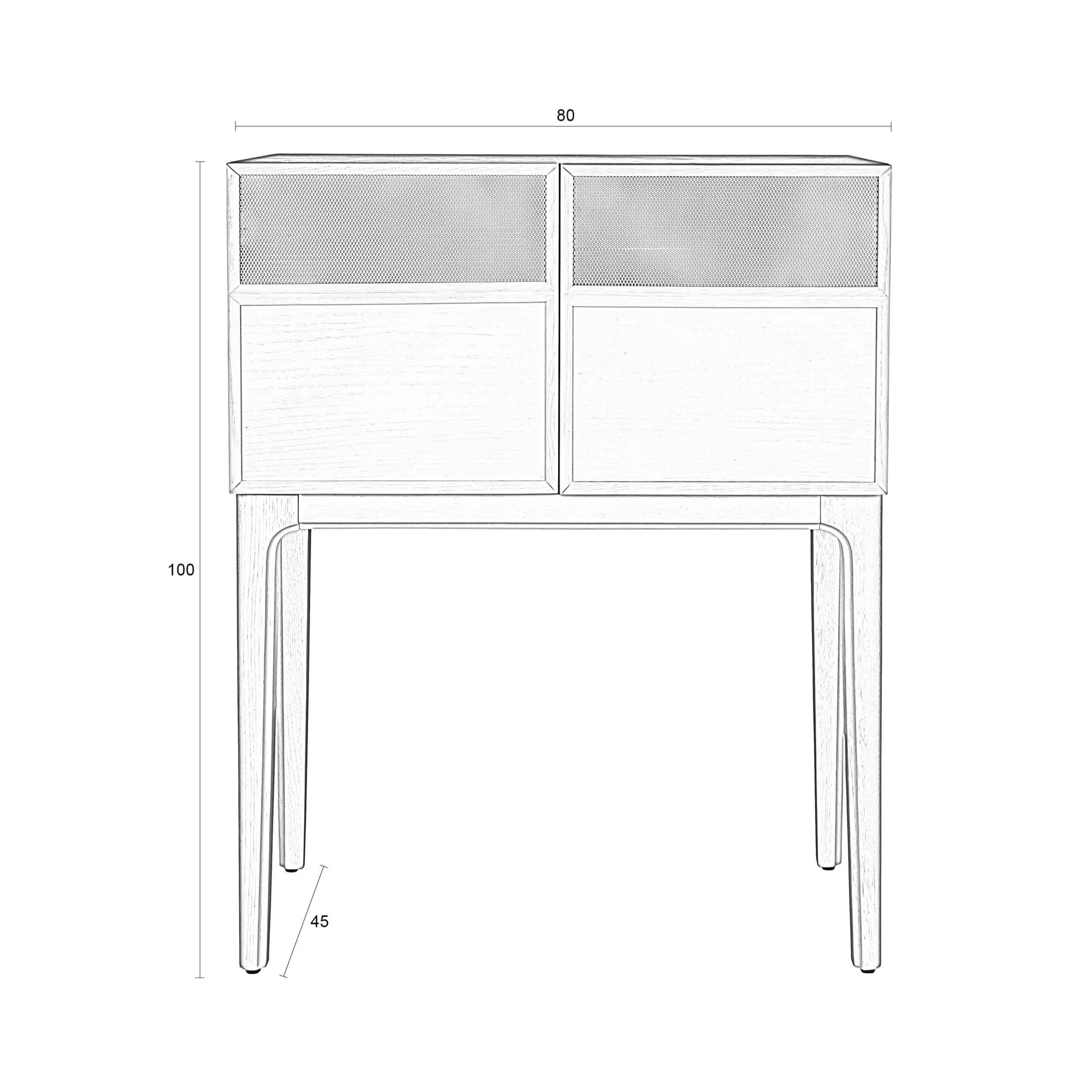 Das cremegeläutete Finish betont die natürliche Zeichnung von Eichengläser. Metall-, Openwork -Türen haben Augenfassen. Die erhöhten Beine verleihen der Kommode Leichtigkeit.