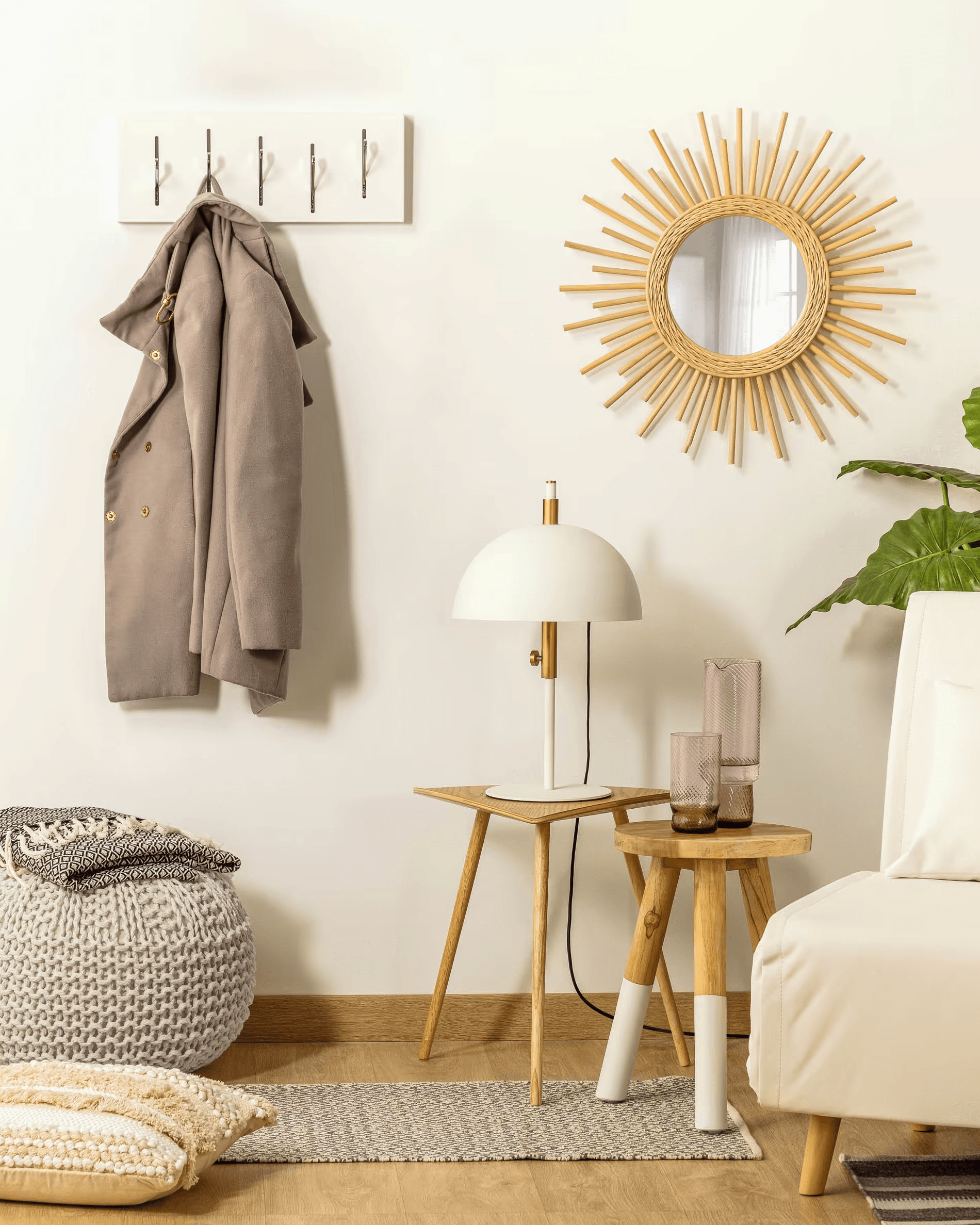 Aufhänger Andrey aus in Weiß bemaltes Zink hat 5 faltende Stahlbügel mit einem Chrom -Finish, das Sie falten können, wenn Sie sie nicht verwenden. Da es an der Wand montiert ist, nimmt es außerdem wenig Platz ein. Ideal für die Aufbewahrung von Zubehör, um sie immer zur Hand zu haben.