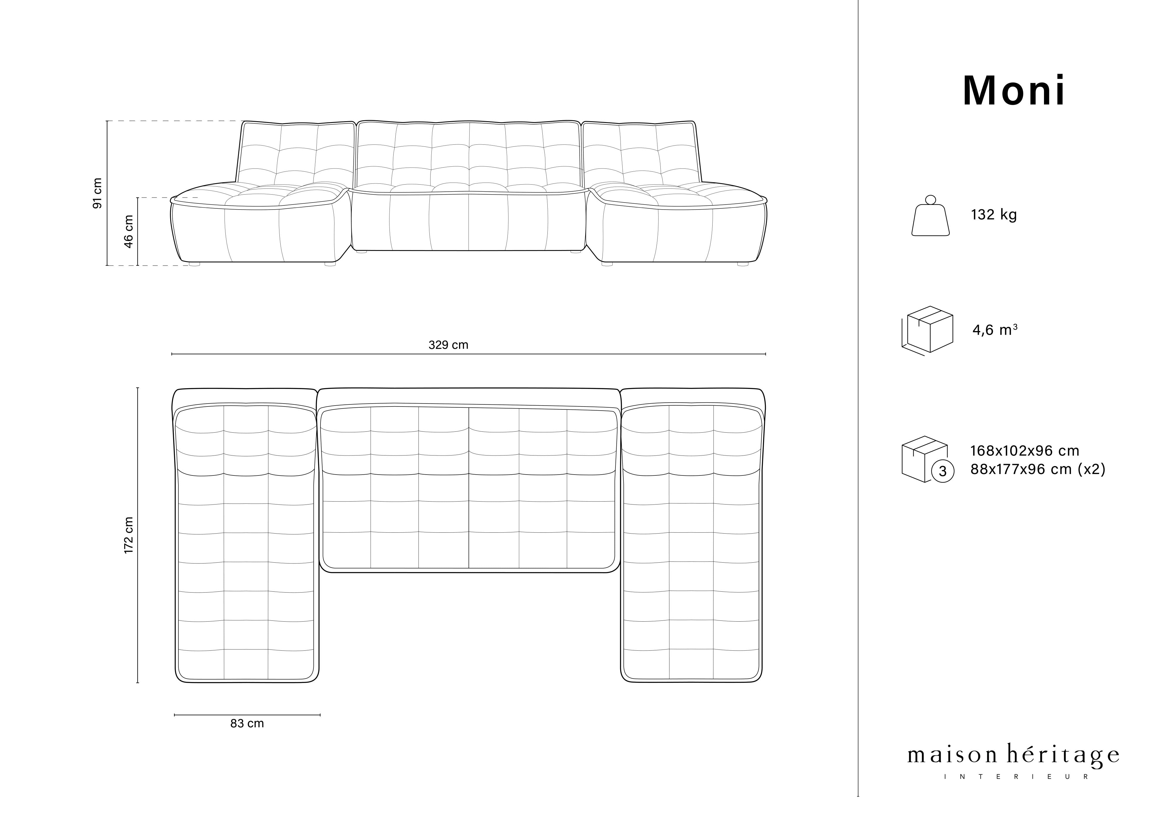 Die Polsterung aus natürlichem Kowid wird sanft gepresst, dank seiner Struktur ist es sehr angenehm angenehm. Ergonomische Formen gewährleisten kostenlose Unterstützung. Die Moni -Kollektion umfasst mehrere Kombinationen von Sofas und Ecken sowie Elemente wie Sessel, Chaise und Poufs.