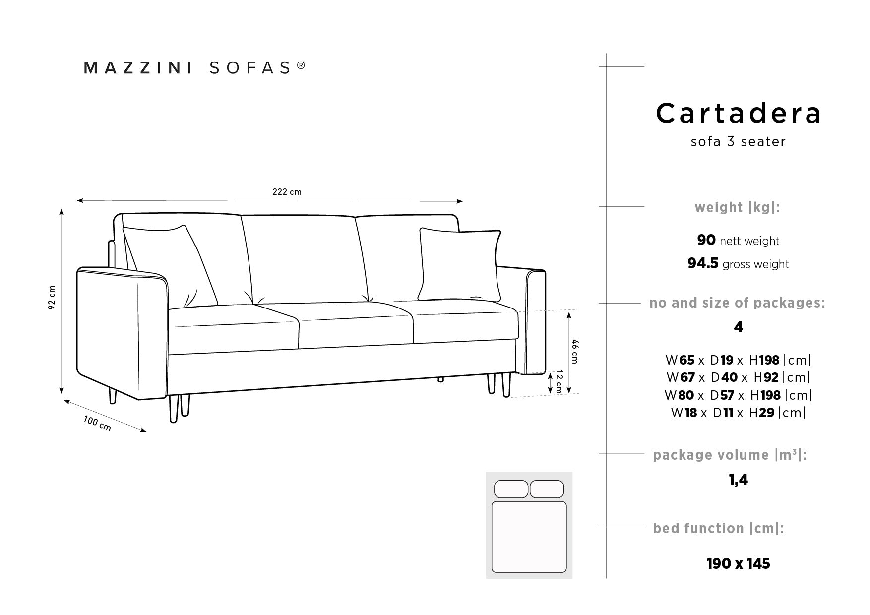 Dimensionen des Schlafraums: 190 x 145 cm