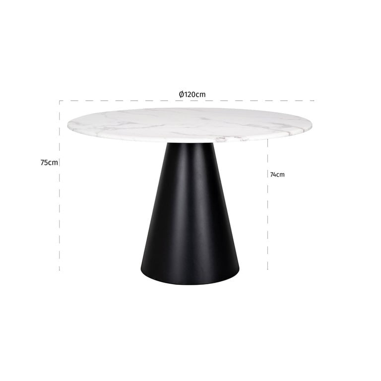 Degas zu Esstisch mit einem eleganten und einzigartigen Charakter. Das runde Oberteil ist mit einem festen Konglomerat dekoriert, der weißem Marmor imitiert, was ihm einen luxuriösen Look verleiht. Die konische Basis besteht aus schwarzem Edelstahl und erzeugt ein kontrastierendes und modernes Element.