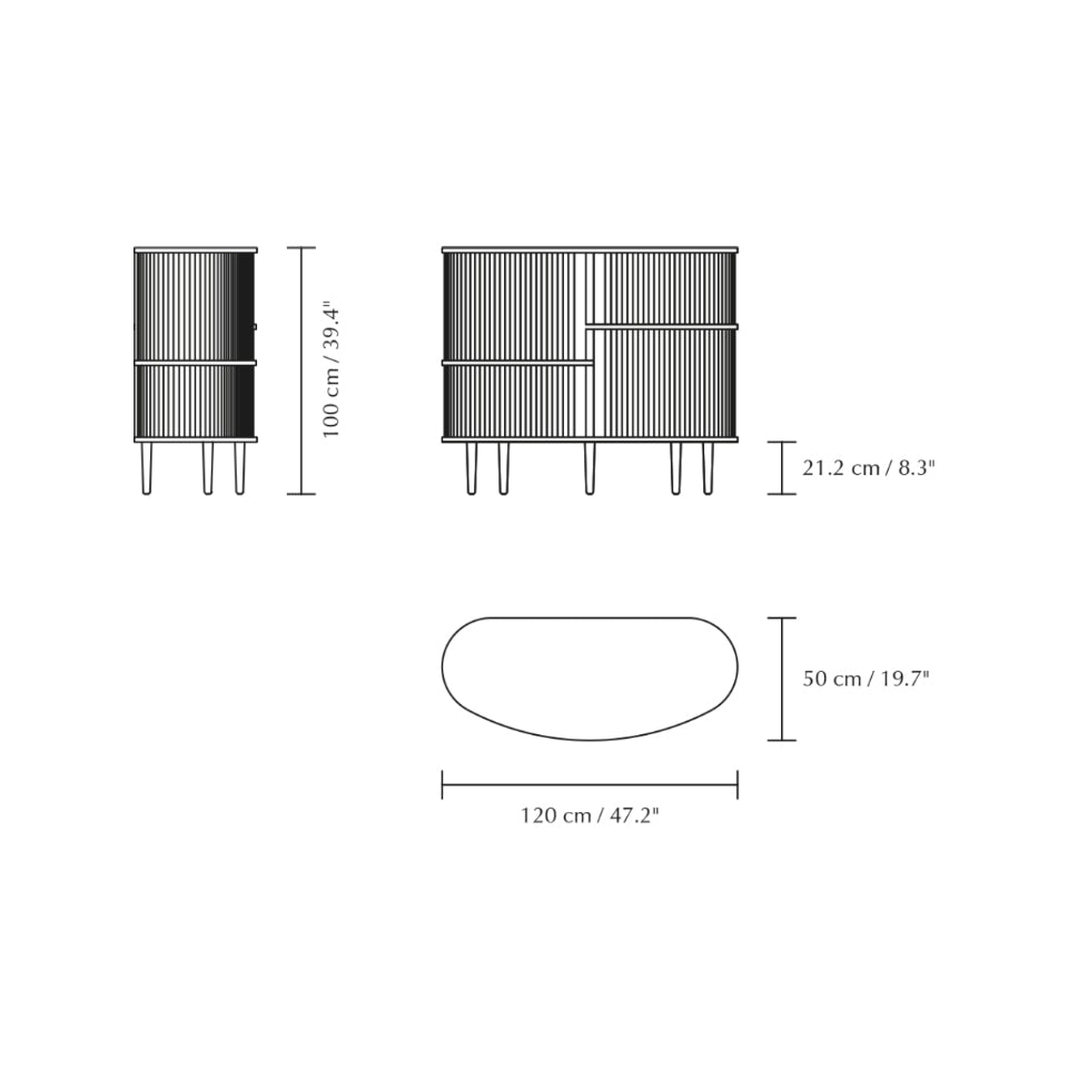 Die Jalousien des Schranks Audacious lassen sich leicht austauschen, was die Möglichkeit bietet, das Aussehen des Möbelstücks zu erneuern, ohne einen völlig neuen kaufen zu müssen. So schonen Sie natürliche Ressourcen und verlängern die Nutzbarkeit des Möbelstücks. Der Schrank ist in zwei Farben erhältlich: Eiche und dunkle Eiche, und die Jalousien sind in vier Standardfarben des Stoffes Horizons erhältlich, der zu 100 % aus recyceltem Material besteht.