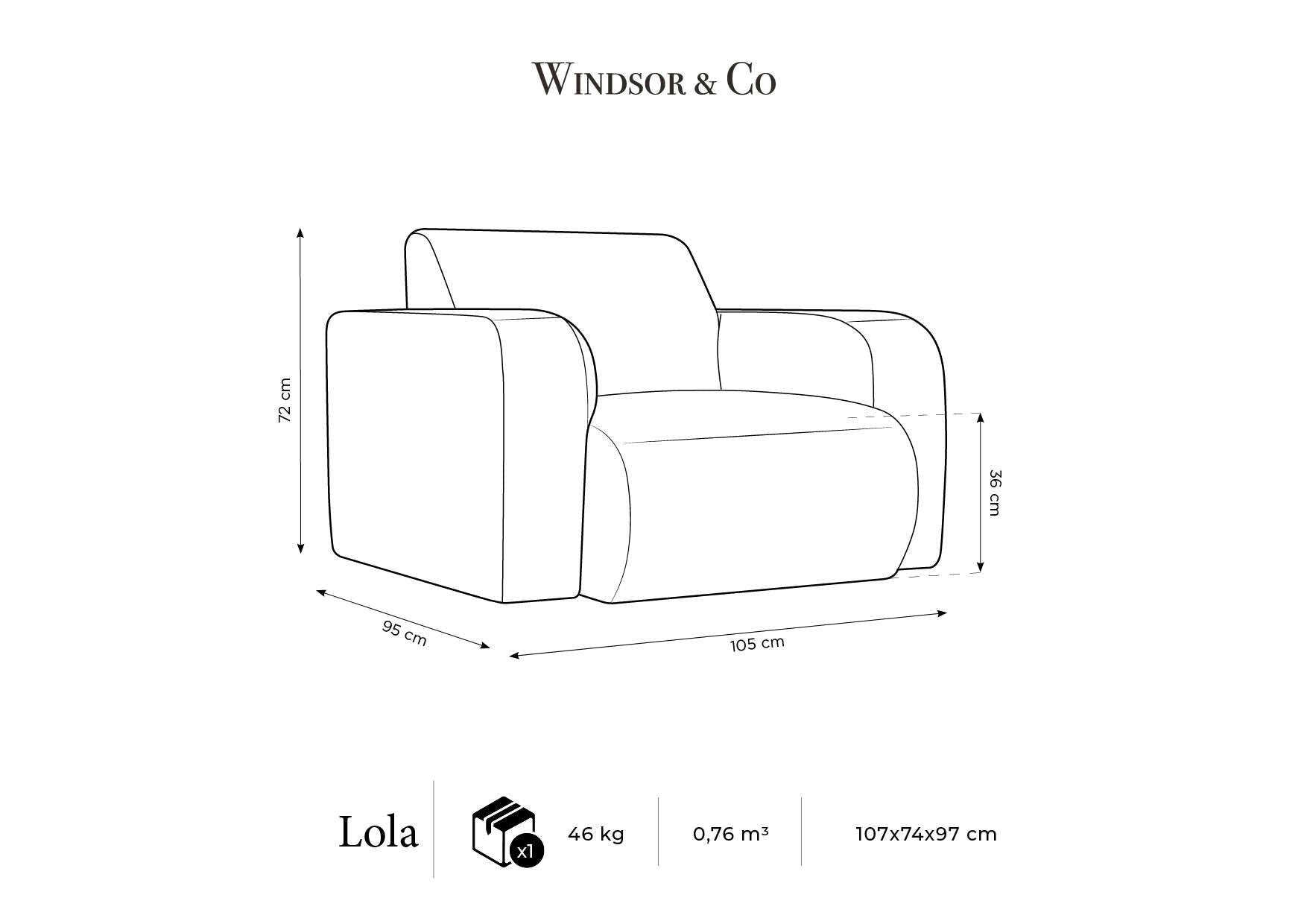 Dank seiner Abmessungen ist der Lola -Sessel perfekt als bequemer Ort, um in jedem Raum zu entspannen. Sein modern Design und präzise Leistung verleihen dem Innenraum einen einzigartigen Charakter und Stil.