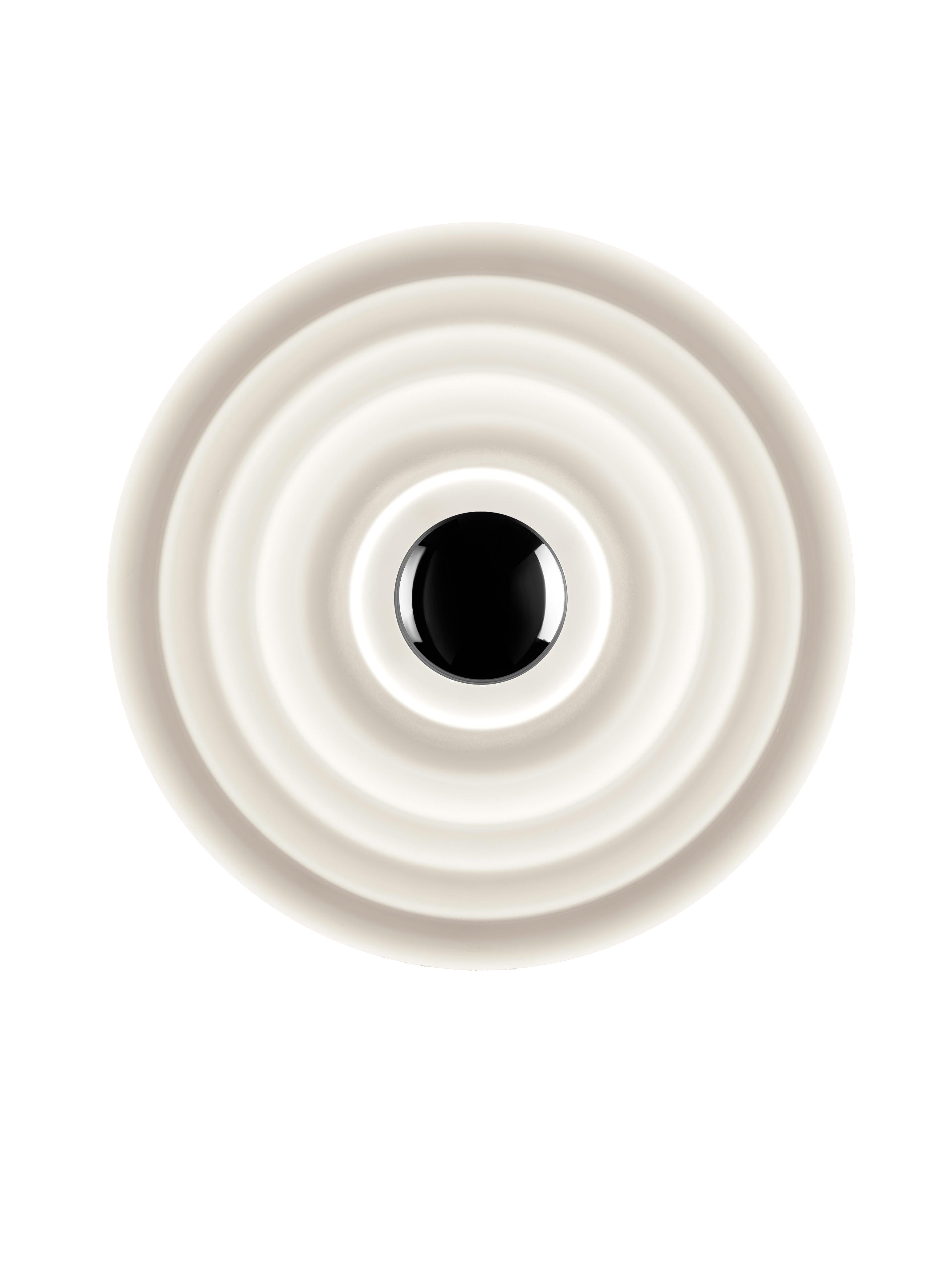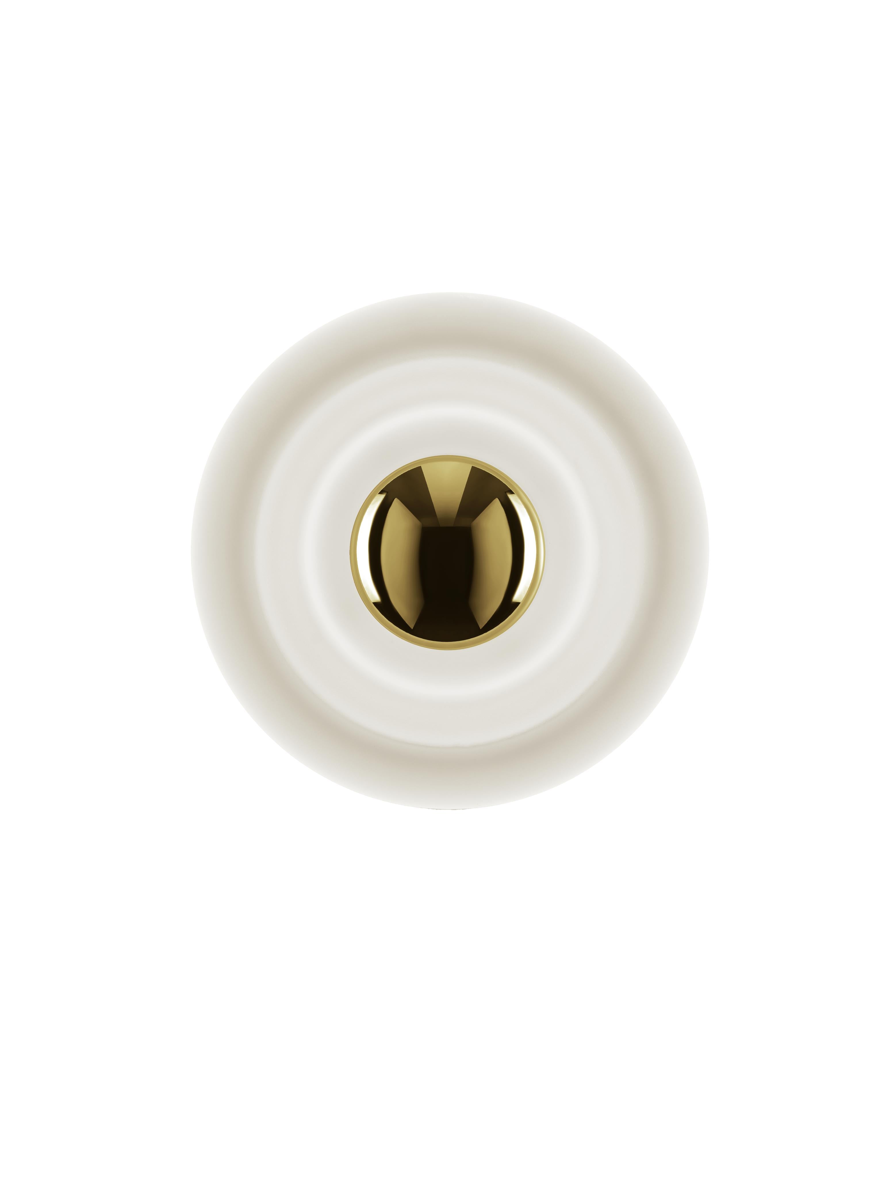 Wandleuchte Press ist ein Vorschlag für diejenigen, die nach außergewöhnlicher Beleuchtung mit markantem Charakter suchen. Ihre massive Form, inspiriert von einer Boje, sowie das präzise geprägte, matt sandgestrahlte Glas verleihen dem Raum einen modernen und gleichzeitig subtil dekorativen Effekt. Dadurch schafft die Lampe ein angenehm weiches Licht, das gleichmäßig verteilt wird und die Struktur der Umgebung betont. Dies ist die ideale Wahl sowohl für elegante Wohnzimmer als auch für funktionale Nutzräume.