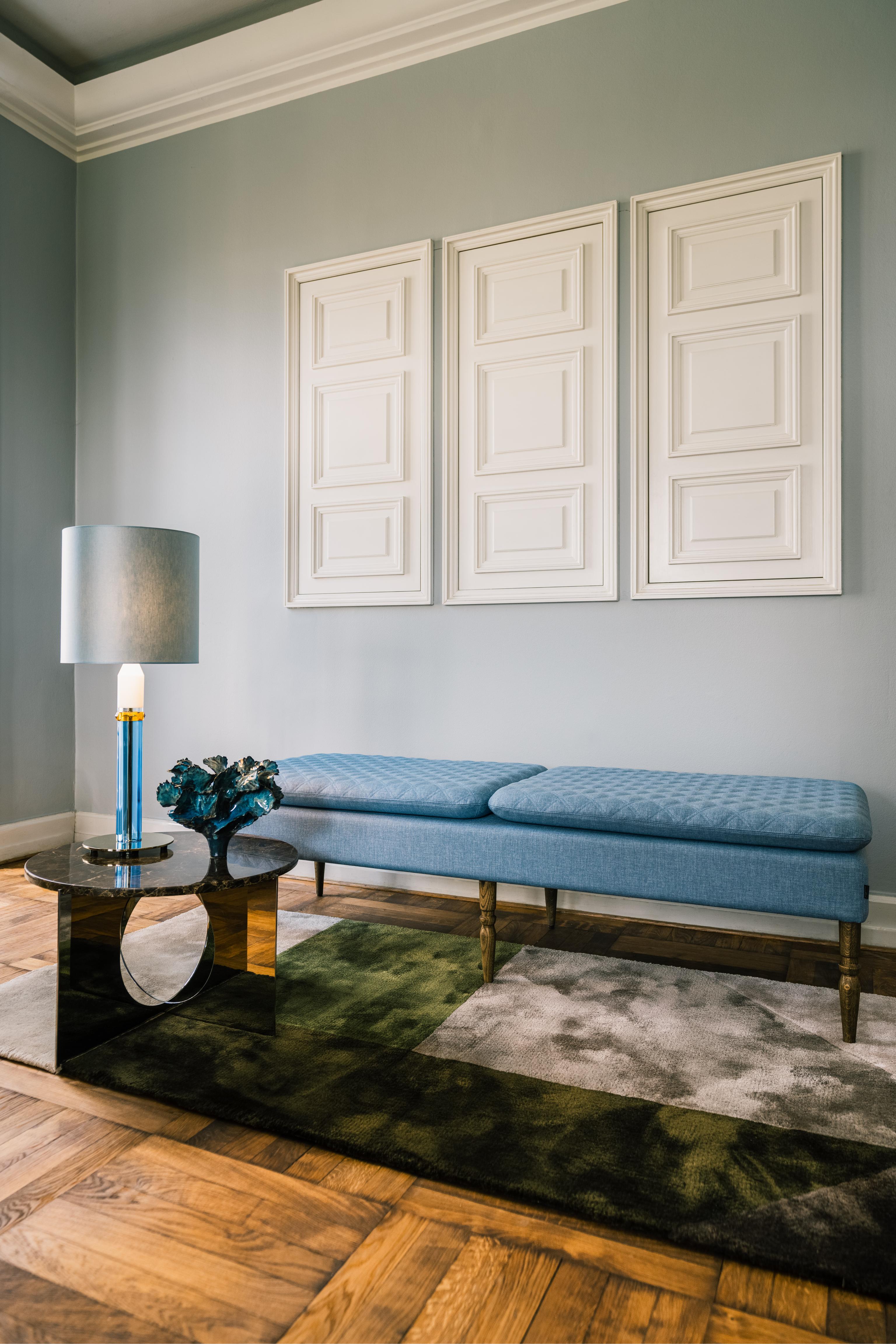 Każda lampa biurkowa Carnival No. 1 to ręcznie wykonane dzieło sztuki. Ręcznie robiony jedwabny abażur w odcieniach jasnoniebieskim i białym idealnie komponuje się ze złotą podstawą, nadając całości ekskluzywnego charakteru. To lampa, która przyciąga uwagę i wprowadza do wnętrza artystyczny, luksusowy klimat – idealna do salonu, sypialni lub reprezentacyjnego biura.