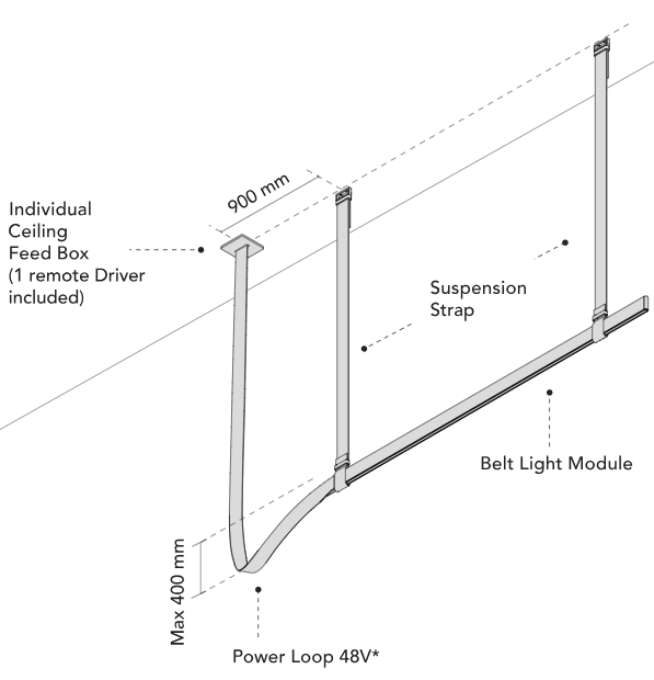 Die Montage der Leuchte erfolgt mithilfe von Bändern, die durch metallische Klammern gezogen werden, die als Deckenhalterungen dienen. Die Längenverstellung der Bänder ermöglicht es, die Komposition an verschiedene räumliche Gegebenheiten anzupassen. Die Stromversorgung und das Steuerungssystem sind im Inneren der Bänder verborgen, was die Form rein und die Ästhetik maximal gewährleistet. Jede Lichtquelle kann unabhängig dank des integrierten CASAMBI-Systems gesteuert werden, das über eine spezielle App bedient wird. Belt ist eine Beleuchtung, die sowohl durch ihre Form als auch durch ihre Funktionalität begeistert.