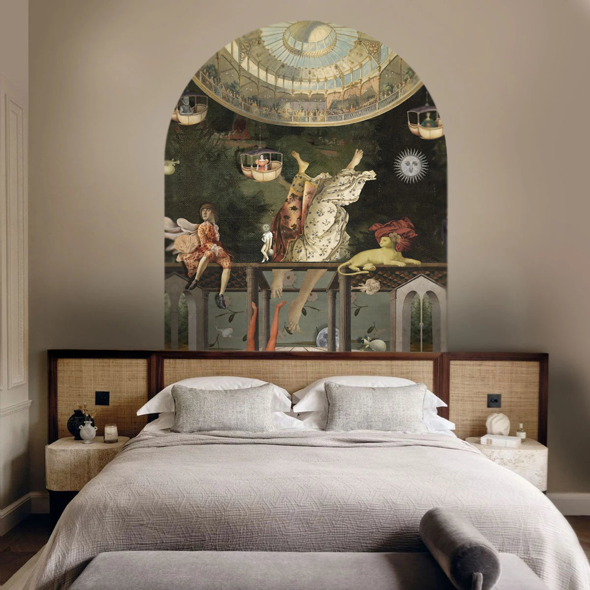 Bogenförmiges Wandbild Vintage Garden Arras ist eine Wanddekoration, inspiriert von der Anmut vergangener Gärten, die mit subtilen, klassischen floralen Motiven gefüllt sind. Zarte Details und eine elegante Komposition schaffen eine romantische, stilvolle Atmosphäre, die zeitlosen Charme und visuelle Leichtigkeit in den Raum bringt. Florale Akzente in harmonischen Farben betonen den raffinierten Charakter des Wandbildes, wodurch es zu einem einzigartigen Schmuckstück für jeden Raum wird.