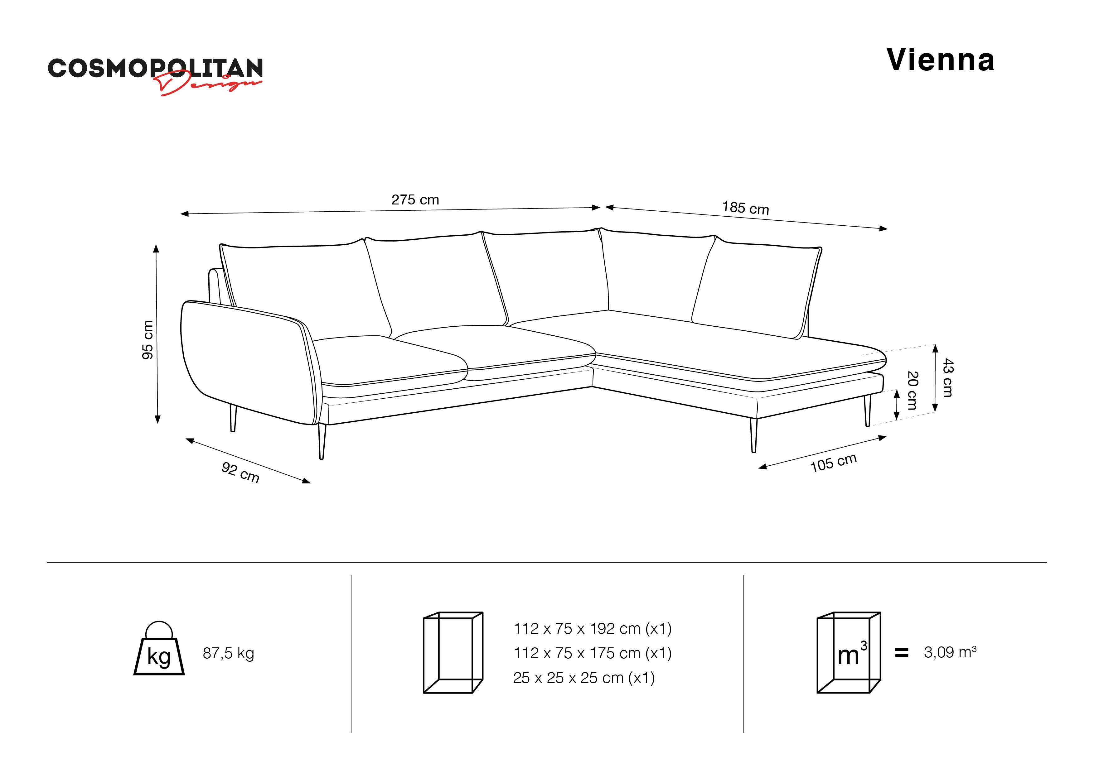 Samt-Ecksofa für 6 Personen, rechtsseitig, VIENNA in königsblau mit goldenem Fuß
