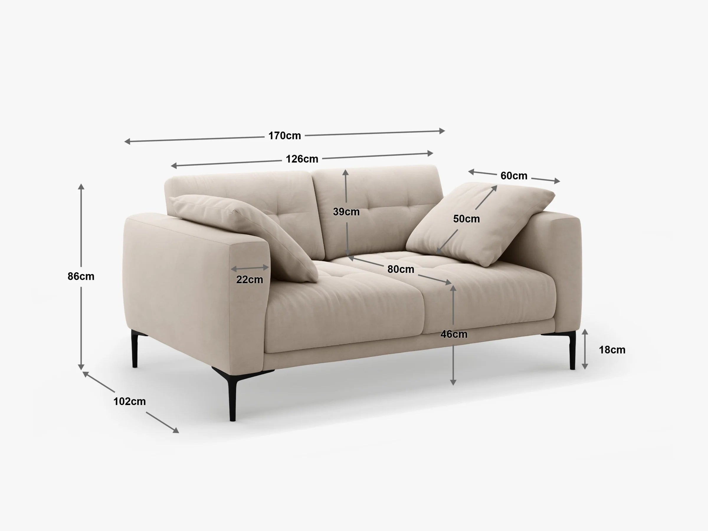 2-Sitzer Sofa Bemy ist eine Kombination aus modernem Eleganz und täglichem Komfort. Ihre leichte, schlanke Silhouette, unterstützt von hohen Metallbeinen, verleiht dem Raum Harmonie und lässt das Sofa gleichzeitig visuell besonders leicht erscheinen. Es ist die ideale Wahl für das Wohnzimmer, das Home Office oder kleinere Räume, in denen sowohl Design als auch Bequemlichkeit zählen.