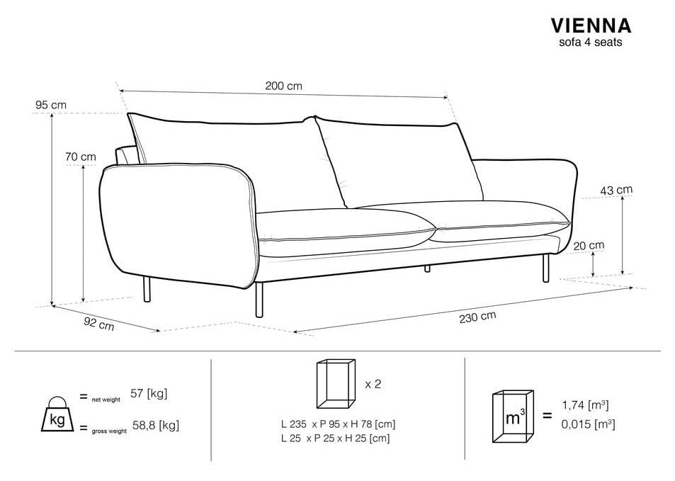 Sofę Vienna wyróżniają piękne proporcje i harmonijne kształty. Sofa do salonu jest nie tylko wygodna, ale też wprowadzi do wnętrza nutę paryskiego szyku i elegancji. Subtelny kształt i miękkie siedzisko zapewnią niezwykły komfort użytkowania. Metalowe nogi nadają całej formie lekkości.