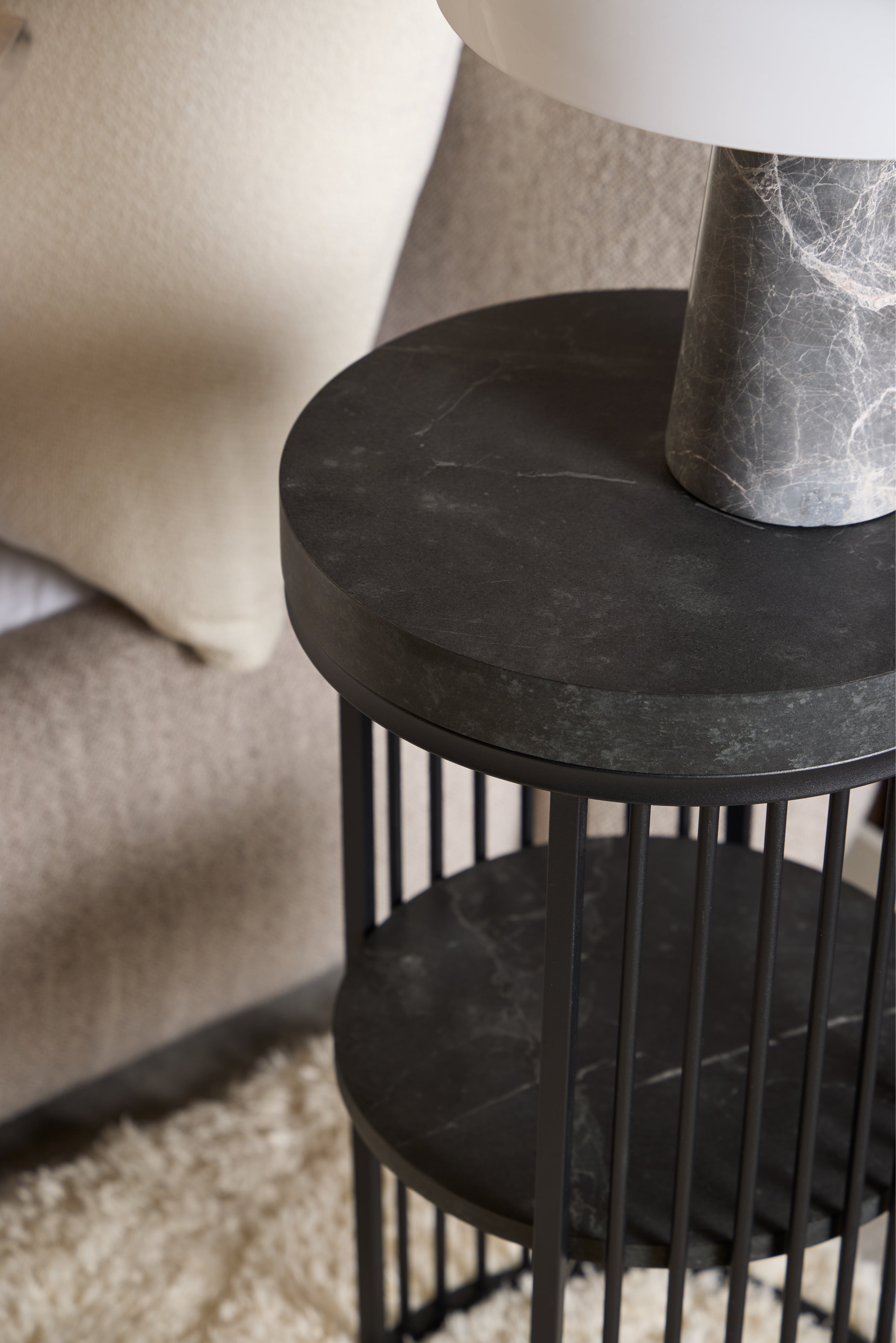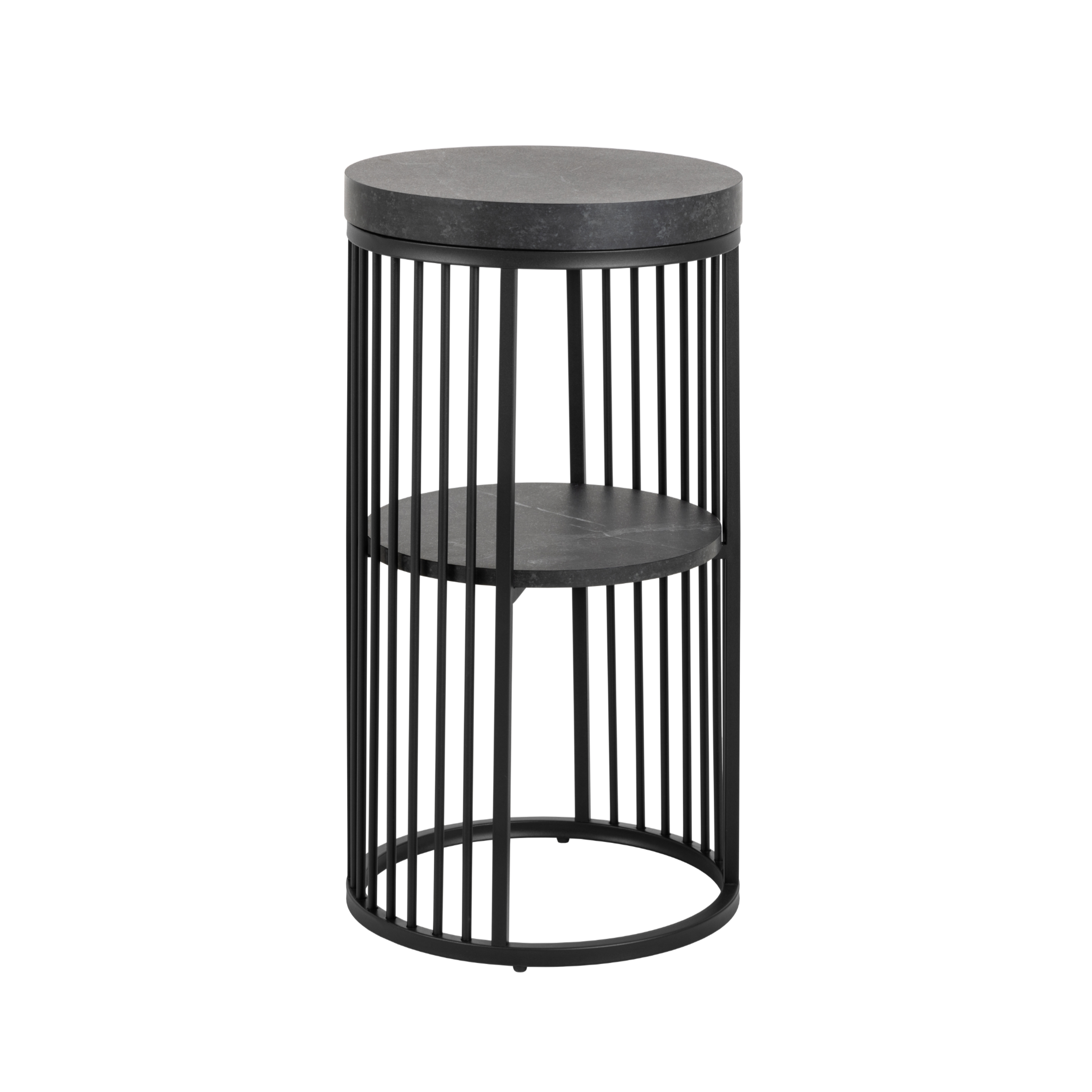 Nowoczesny stolik nocny Strington to wyjątkowy mebel inspirowany współczesną architekturą. Jego forma przypomina smukłą kolumnę, łącząc minimalistyczny design z wyrazistym charakterem. Blat i półka w matowym, czarnym wykończeniu z efektem marmuru Izmir doskonale kontrastują z otaczającą je konstrukcją z pionowych, metalowych prętów. Otwarta, a zarazem zamknięta forma stolika tworzy intrygującą grę światła i cienia, wprowadzając do wnętrza nowoczesną elegancję.