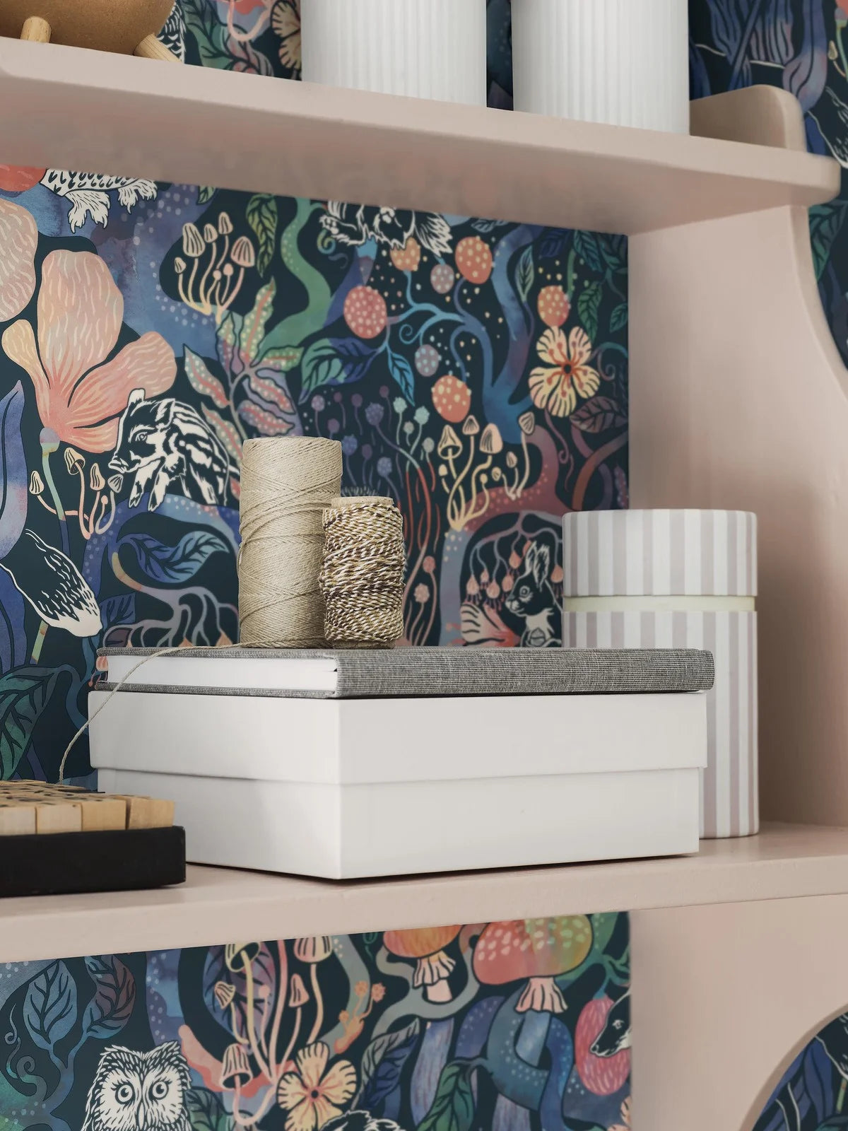 Tapete für Kinder mit dem Motiv des märchenhaften Waldes MAGIC WOODS blau mit rosa