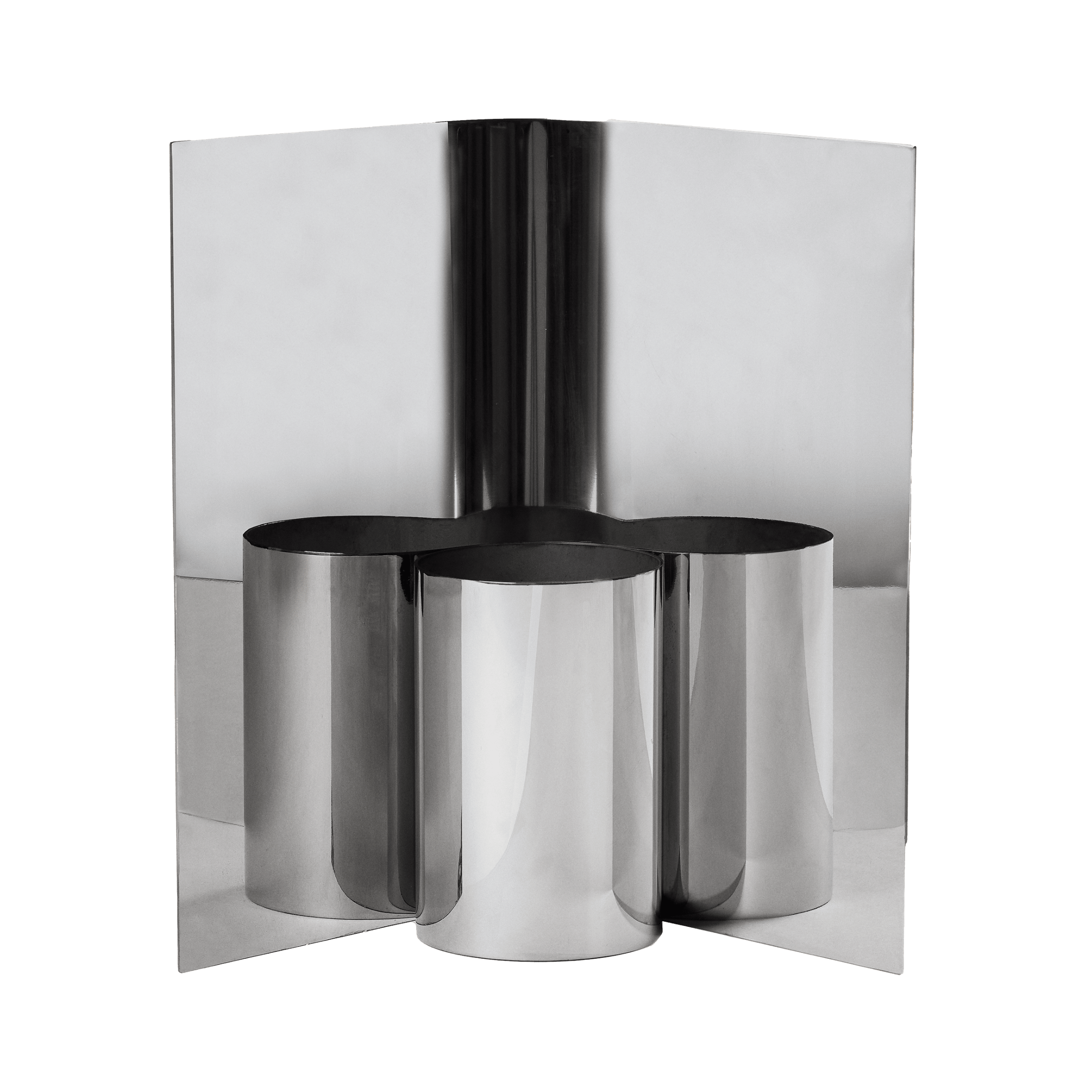 Die Vase Eddy ist eine mutige, moderne Form aus poliertem Edelstahl, die die Umgebung wie ein Spiegel reflektiert. Das zylindrische Innere wird von einem konzentrischen, gebogenen Blech umgeben, das über die Höhe der Vase hinausgeht und eine skulpturale Silhouette mit starkem visuellem Effekt schafft. Dieses minimalistische, aber ausdrucksstarke Design präsentiert jeden Blumenstrauß wunderschön, indem es dessen Formen und Farben reflektiert und so zu einem echten Blickfang im Raum wird.