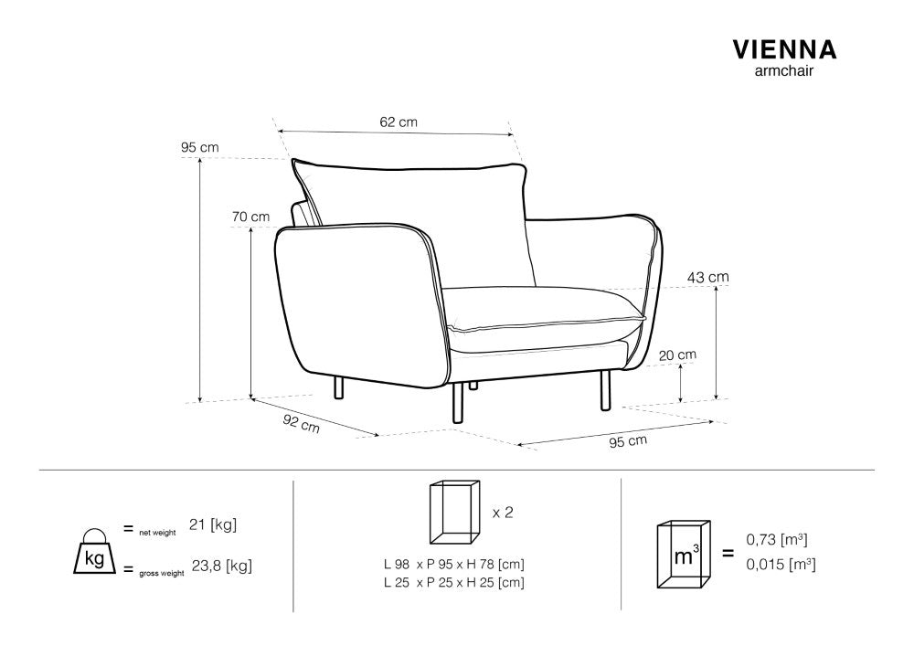 Designerski fotel Vienna wyróżniają piękne proporcje i harmonijne kształty. Fotel jest nie tylko wygodny, ale też wprowadzi do wnętrza nutę paryskiego szyku i elegancji. Subtelny kształt, delikatna podłokietniki i miękkie siedzisko zapewnią niezwykły komfort użytkowania. Metalowe nogi nadają całej formie lekkości.