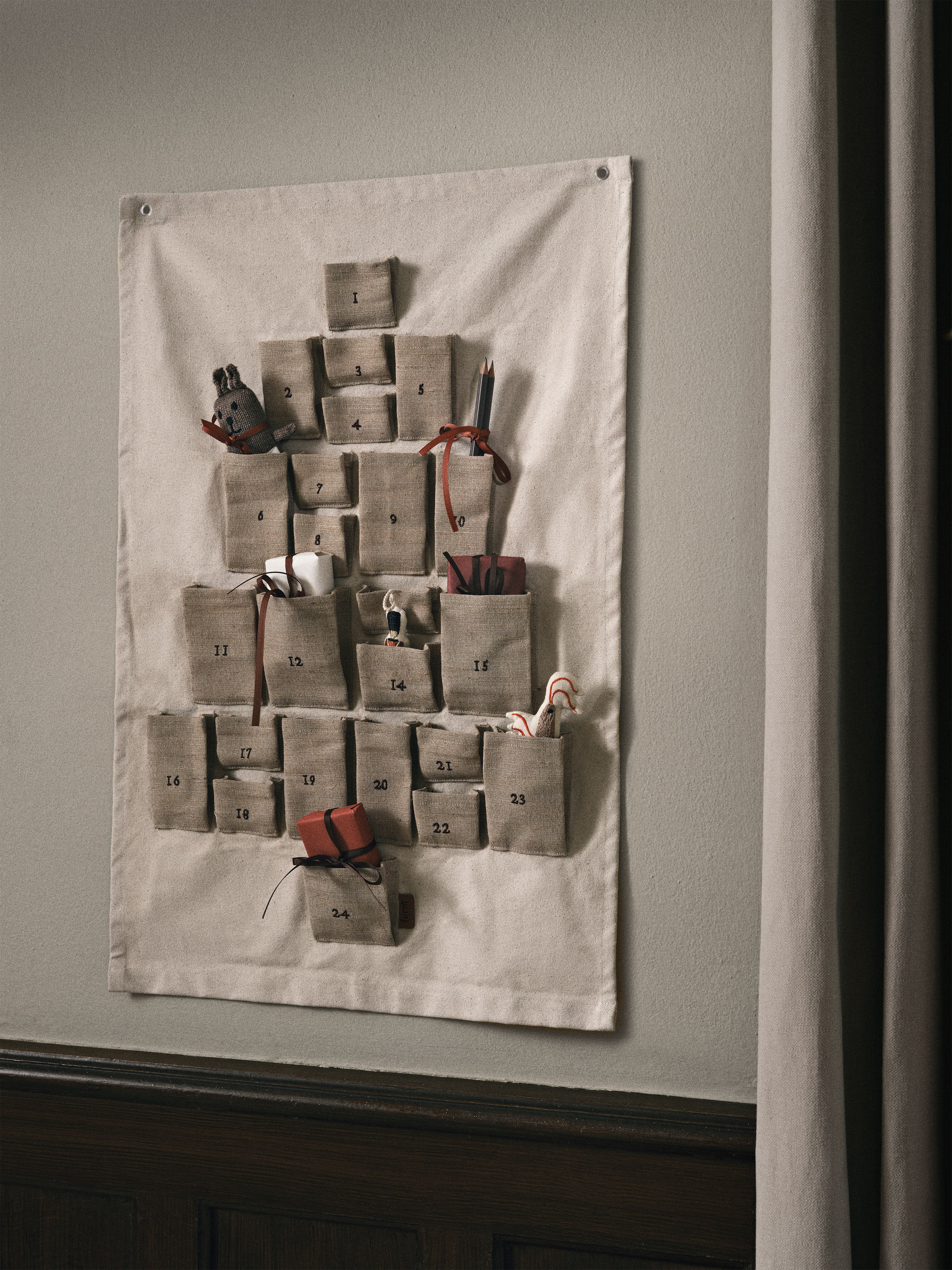 Kalendarz adwentowy Pine Christmas Calendar to nowoczesna interpretacja duńskiej tradycji julekalender, czyli kalendarza adwentowego, który pozwala celebrować każdy dzień grudnia aż do Wigilii. Wykonany z niebarwionego płótna bawełnianego oraz naturalnej juty, tworzy kształt świątecznego drzewka, na którego kieszonkach wyhaftowano numery od 1 do 24. Każda kieszonka może skrywać drobny upominek, słodycz lub liścik, dzięki czemu codziennie można odkrywać nową porcję świątecznej radości.