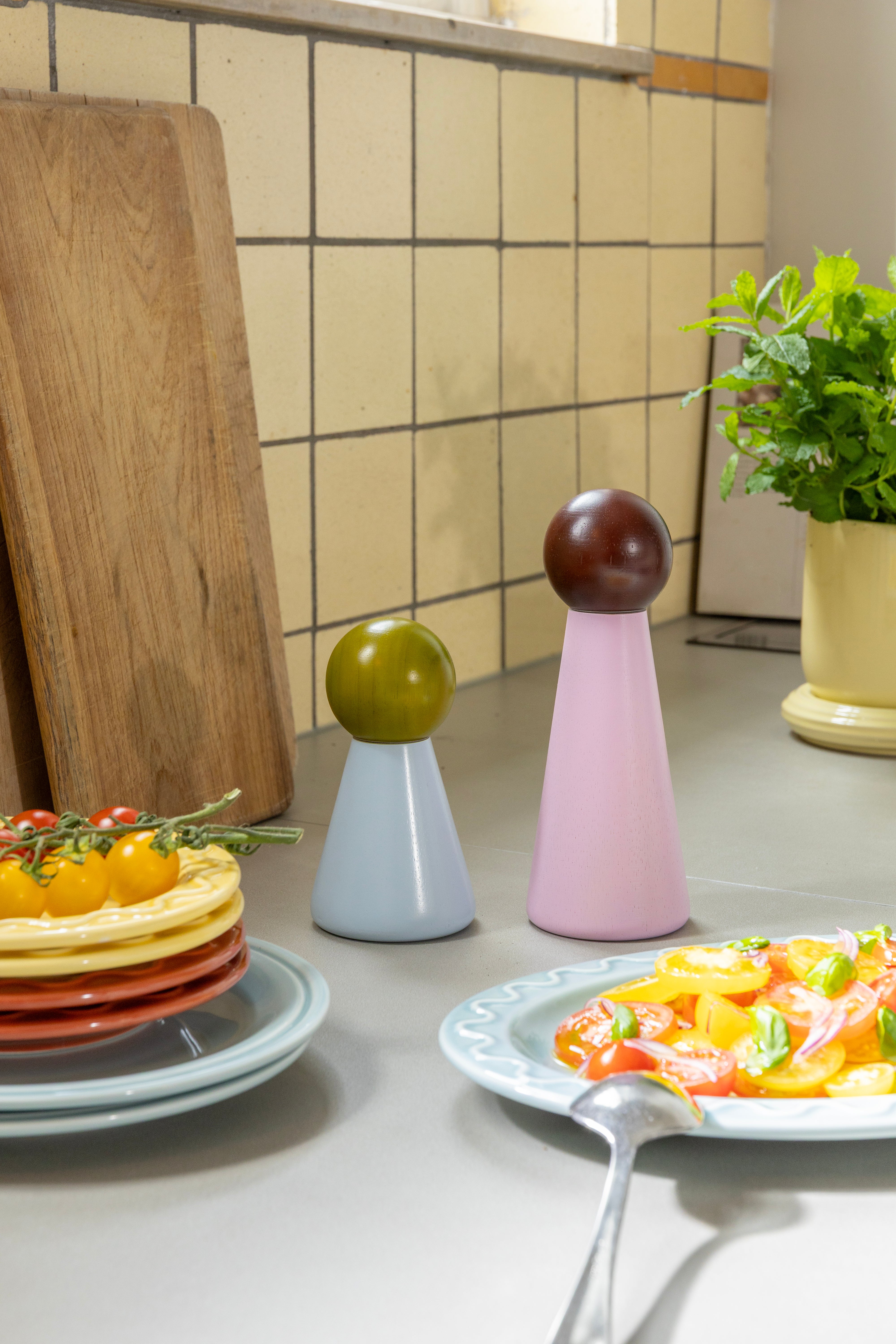 The Salt and Pepper Mill Halma combines functionality with a playful yet elegant design. Inspired by classic game pieces, this mill brings color, lightness, and a unique style to your kitchen. Its harmonious color palette and visible wood grain make the mill not just a practical tool, but also a decorative accent on your countertop or table.