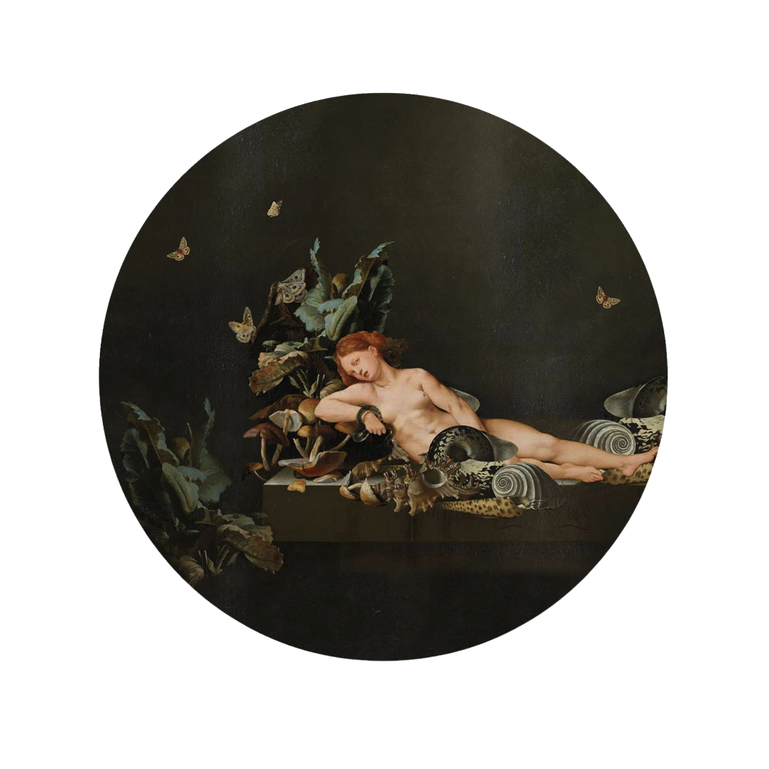 Mural Dots Cleopatra is a round wall decoration inspired by the legendary queen of Egypt. The portrait of a woman with golden, graphic accents and a proud, confident gaze embodies strength, elegance, and a contemporary interpretation of a historical motif. The subtle combination of black, gold, and muted tones gives the composition a noble, artistic character.