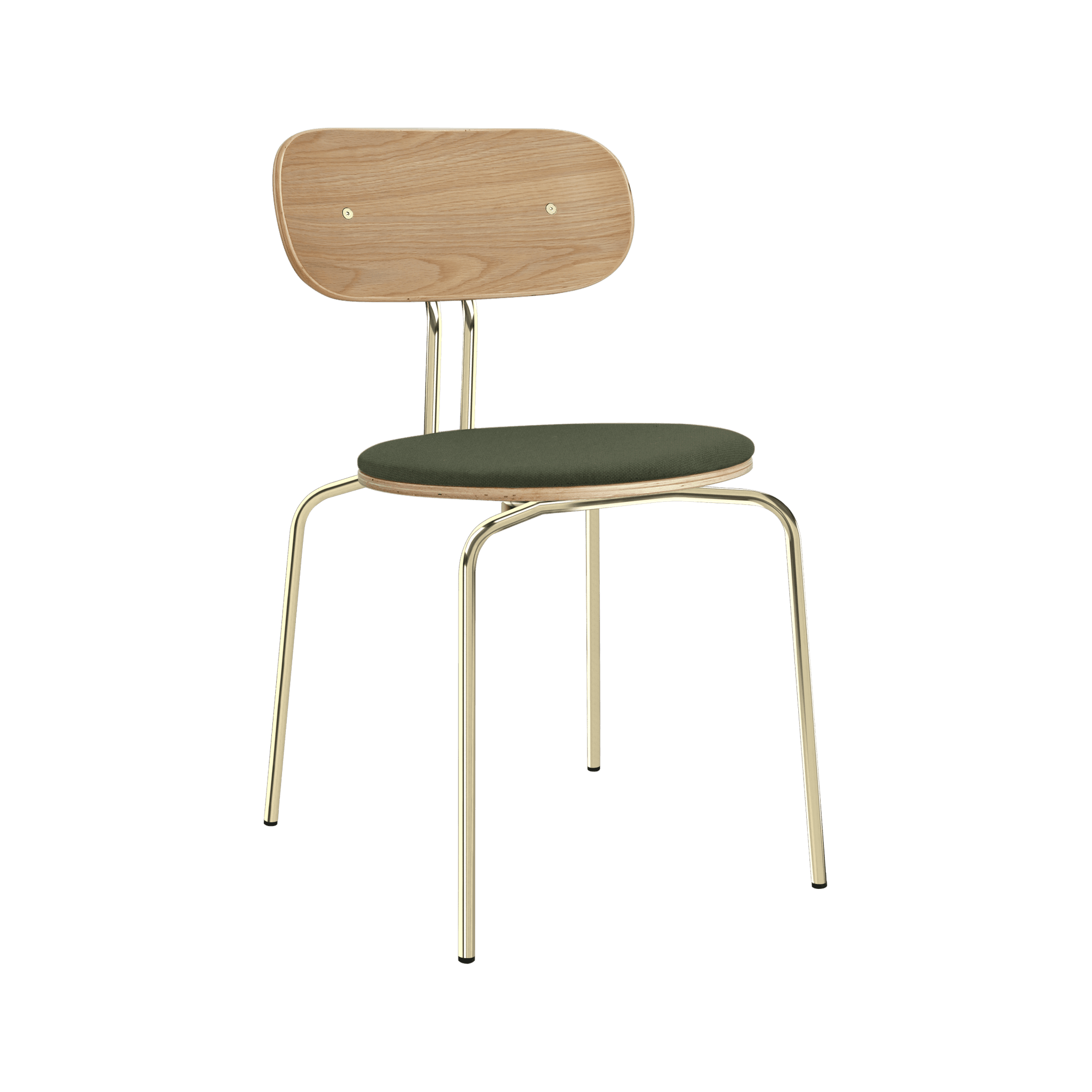 Chair Curious is elegant, light and minimalist furniture, made of oak veneer. It is available with brass or black legs, and the optional seat cushion provides additional comfort. You can choose a pillow from 17 colors of Horizons fabric, made 100% recycled, as well as in a brown or white shade of Teddy Bear fabric.