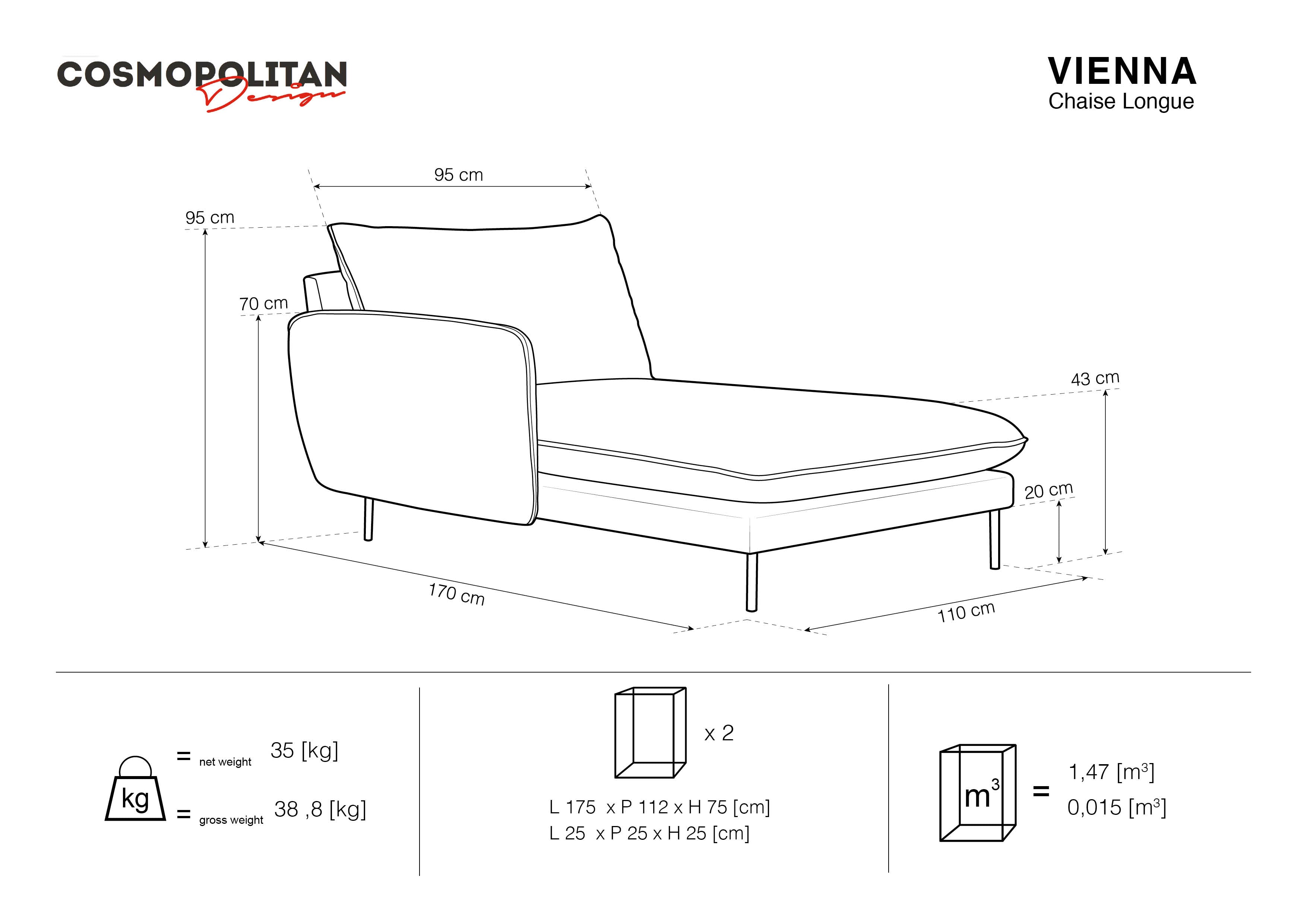 Left-facing velvet chaise longue VIENNA light blue with black base