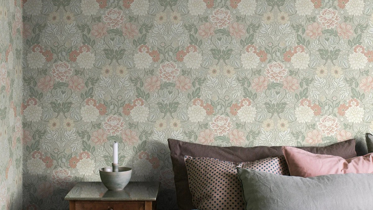 Non-woven paper wallpaper with a floral pattern DAHLIA GARDEN light green with white and pink