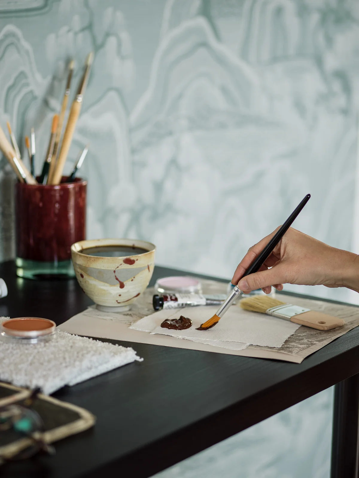 Indigo Garden Wallpaper with a hand-painted pattern brings timeless charm to your interior, captivating from the very first glance. The background of the wallpaper has a calm, watery appearance that perfectly contrasts with the rich, vibrant botanical design. The intricate yet harmonious pattern, full of details, creates a space filled with cozy elegance and tranquility.