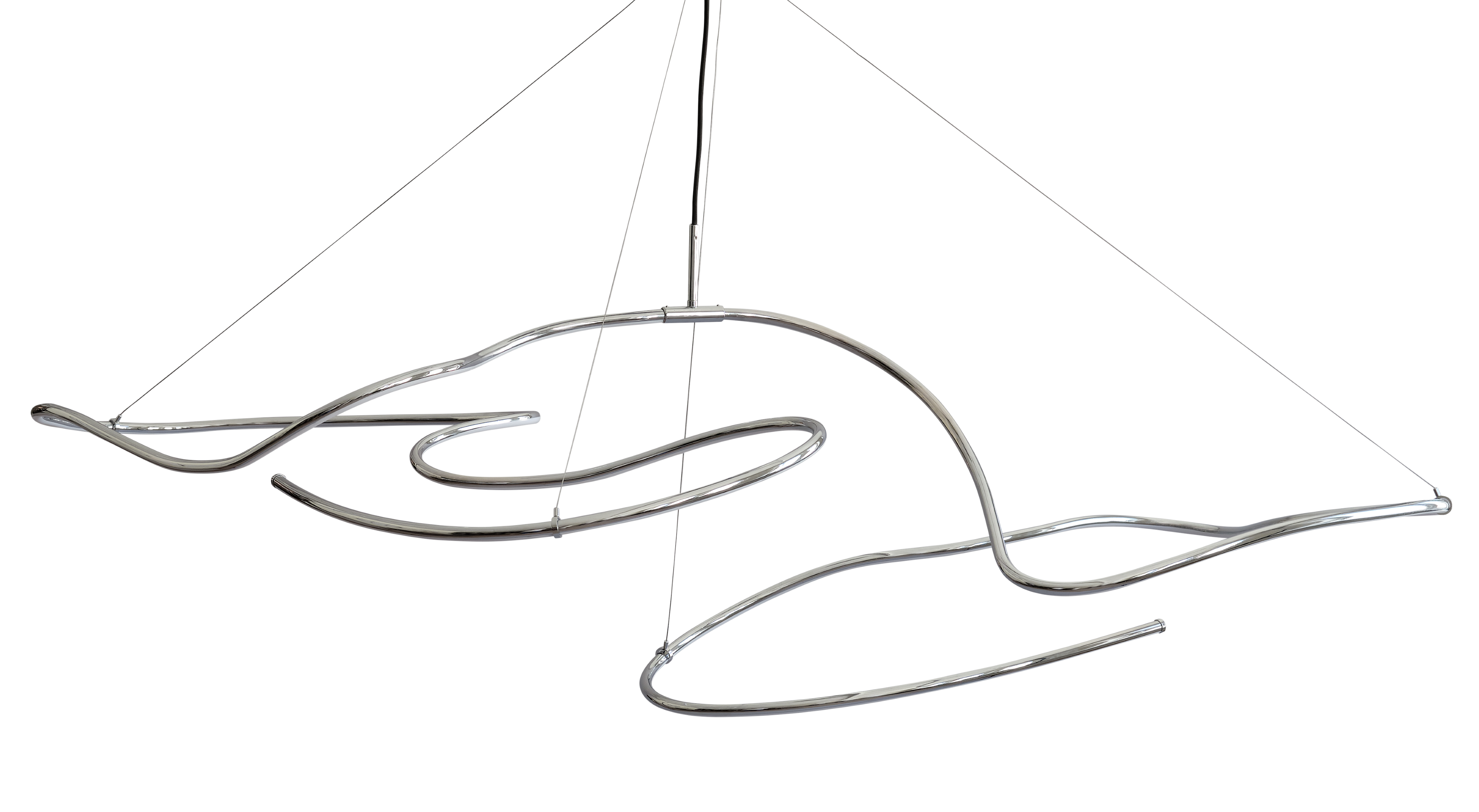 Available in two sizes, the Ghost chandelier includes built-in LED lighting. This series features a luminous acrylic tube housing a durable LED light source, offering an impressive 25,000 hours of illumination at a warm temperature of 2400 Kelvin. Departing from the starkness typically associated with neon, these innovative lamps emit a warmer, more inviting glow, creating an atmosphere of coziness and comfort. Metal accents provide a refined finish to the minimalist design. Suspended by four adjustable stainless steel cables, the chandelier can be set at the perfect height for any room.